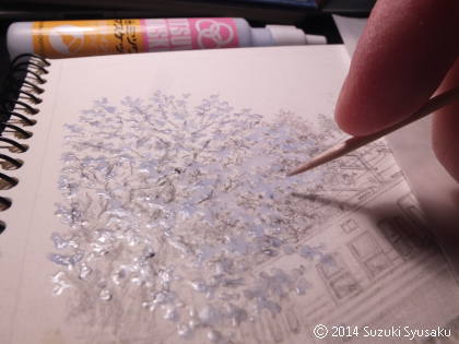久々にマスキング液を使ってみました。 思惑通りの白抜きが現れてくれるかどうか…? 剥がしてみるまで分からないのはプレッシャーです。----おしらせ----【作品掲載】日本の美を伝える和風年賀状素材集「和の趣」未どし版発売中!>>詳細はこちら(※PC/携帯共用)【作品掲載】季刊「スロウ」2014秋号発売中!>>詳細はこちら(※PC/携帯共用)【作品掲載】小学館SJムック「とっておき寝台列車の旅」6/19発売! >>詳細はこちら(※PC/携帯共用)【札幌の水彩色鉛筆画家】 ~イラストレーター鈴木周作~公式サイトも併せて御覧下さい>>[PC|Mobile|北斗星乗車記|えちてつ絵日記]