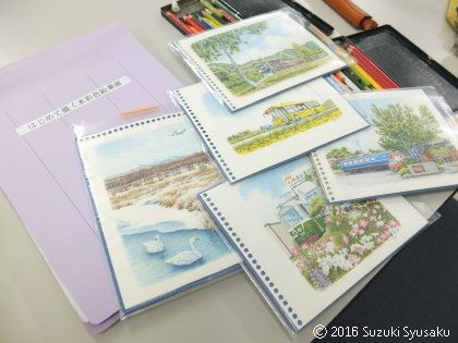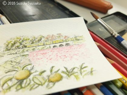 午前中はNHK文化センター新さっぽろ教室の水彩色鉛筆画講座。 先日の水曜クラスでもこの方法で多少手応えを感じたので、同様に今日の土曜クラスでも、完成した原画を何枚か持ち込んで「空の描き方」を講釈してみました。 輪郭線を描かずに雲の形を表現するあたりが、やはり難しいと感じてしまう方が多いようですね。 結局最後は「慣れ」とか「場数」とか、そういう話になってしまいそうなところですが、それで済ませてしまっては講師として無責任すぎますから、きちんと噛み砕いて「これならできそう!」と思って頂けるよう、私のほうもしっかり取り組んでいかねばと思います。 窓の向こうの市営住宅跡はすっかり綺麗な更地になってしまいました。 新しい商業施設が作られるという話もあるようですが、まだまだ先の話かも知れませんね。【札幌の水彩色鉛筆画家】 ~イラストレーター鈴木周作~公式サイトも併せて御覧下さい>>[PC|Mobile|北斗星乗車記|えちてつ絵日記]