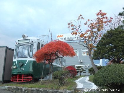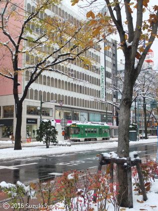 朝、目が覚めると外はすっかり雪景色でした。 午後になって出かける頃には止んでしまっていましたが、明け方頃はかなり激しく降っていたらしく、ササラ電車も今季初出動だったようです。 色づいた駅前通りの街路樹や、まだ緑色のイチョウ並木と白い雪とのコントラストは、真冬とは違う、今の時期ならではの印象深い風景です。【札幌の水彩色鉛筆画家】 ~イラストレーター鈴木周作~公式サイトも併せて御覧下さい>>[PC|Mobile|北斗星乗車記|えちてつ絵日記]
