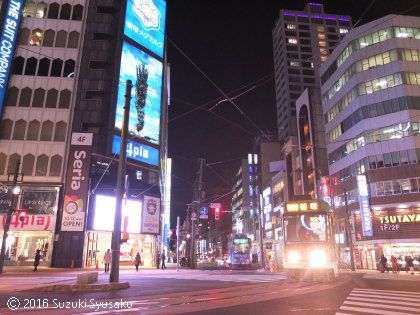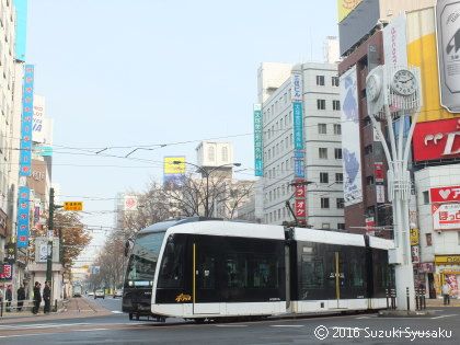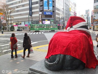 市電ループ化の延伸区間、西4丁目~狸小路~すすきの間の習熟運転が始まったのが、ちょうど1年前の今日11月11日…ということも白状すればすっかり忘れてしまっていました。 電車のある風景が、それだけ当たり前のものとして馴染んでしまったということでしょう。 あの日、初めての電車を見送った西4丁目電停に行ってみると、つい先日までハロウィン姿だった三越前のライオンがいつのまにかサンタさんに変身していました。【札幌の水彩色鉛筆画家】 ~イラストレーター鈴木周作~公式サイトも併せて御覧下さい>>[PC|Mobile|北斗星乗車記|えちてつ絵日記]
