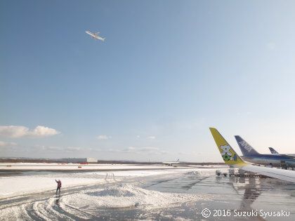 月曜日の朝だからか、それとも何か特別な事情でもあったのか、新千歳空港の保安検査場は大混雑で30分以上も列に並ぶことになりました。 今回は早めに空港に着いていたので大丈夫でしたが、もう1本後の快速エアポートだったらちょっと焦ったかな?という感じです。 なるほど、飛行機利用の場合はこういうケースも想定しておかないといけないんですね。 まだ11月も上旬なのに、駐機場は昨日の雪で真っ白に染まっていました。 これだけ降っていたのなら欠航便が出ていたのも頷けます。 エア・ドゥの名古屋便は何度か乗ったことがありますが、なかなか天候に恵まれなかったので、このあたりの風景が見えたのは多分初めてです。 川の流れと、新幹線の駅と、そこから分かれるローカル線の鉄橋から辿っていって、「あっ、上田城の上空だ!」と気づいた時はちょっと興奮してしまいました。 中部国際空港に降りる前には名古屋城も見えました。 緑に囲まれた名古屋城から、少し右手の高層ビルが見えるあたりが名古屋駅かな?と目印を探して眺めていると、ちょうど真下を新幹線が横切っていきました。 日が短い今の季節、急いで福井に向かっても現地に着く頃には陰ってしまいそうなので、割り切って今日は少し寄り道していくことにしました。 名古屋から電車を乗り継いで約1時間、三岐鉄道北勢線の有名な「めがね橋」へ。 数年前にも一度訪れたことがありますが、今回は水彩画みたいな柔らかな夕陽と満開のコスモスが迎えてくれました。 新幹線と在来線特急を乗り継いで福井に到着。 駅前の「アオッサ」のクリスマスツリーとえちぜん鉄道の取り合わせも、建設中の新駅が完成したら見られなくなってしまうのかも知れませんね。【札幌の水彩色鉛筆画家】 ~イラストレーター鈴木周作~公式サイトも併せて御覧下さい>>[PC|Mobile|北斗星乗車記|えちてつ絵日記]