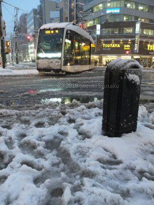 積もり方も、電車や街路樹などの着雪の具合も、むしろ福井や富山あたりで見ているような印象でした。