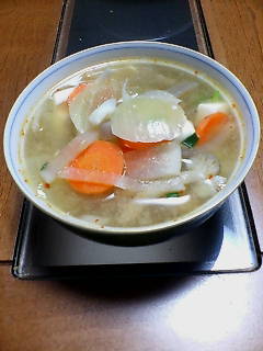 具材は玉ねぎ、にんじん、こんにゃく、大根、豚肉、しめじ、ねぎ