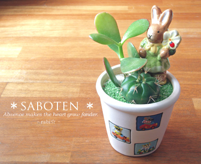 前回の日記に対して、お気遣い下さった皆様、本当にありがとうございました。お陰様で膝の痛みも大分良くなり、階段の上り下りも普通に出来るようになりました(^^)あとはアザが消えて、正座が出来るようになればオッケーかな。それまでは、もうちょっと時間がかかりそうです。膝は大事な部分ですし、大切にしないとですよね。これからは気をつけていきたいと思います。皆様も、不意の怪我には、ご注意下さいね。自分に罪悪感を持つ事は、やめましょう(笑)* * * * * * * * * * * * * * * * * * * * * * * * *さてさて、今日はお休み。髪も切りに行きたかったし、ミッピの牧草もなくなりかけていたので出不精の私には珍しく、朝から外へ出かけました。あいにく美容院は午後じゃないと空いていないとのことで、午後の予約を入れて、ミッピの買い物をしにホームセンターへ。いつものごとく、あちこちふらふらと見た後、園芸コーナーへ行ってみると、とっても可愛いサボテンの寄せ植えの鉢を発見しました。それぞれ2・3種類のサボテンが植えられていてその横に、可愛い動物のピックが差してあり、鉢にも可愛い絵柄入り。わぁいいな~♪ と見ていたら、ものすごく私好みのサボテンちゃんと、うさぎのピックが刺さっている鉢植えを発見!おぉぉ、これは・・・・と、しばし見入った後、思わず連れて帰ってきちゃいました。それが、こちら。丸いサボテンと、草状サボテンの寄せ植え。この、かぼちゃにトゲが生えているような、ぷっくりまるまるした、まるサボちゃんに一目ぼれ(^^)ツヤツヤしていて、とっても可愛いんですよ。名前が解らないのが残念だけれど、なんせサボテンの種類って7000種類以上あるらしく、ネットで調べるのも難しそうなので断念しました(^^;まぁ、そのまんま、まるサボちゃんと、草サボちゃんと呼ぶことにします(笑)サボテンの花を咲かせるのは大変みたいだし、こういう風に土が固めてあるものは余計難しいみたいだけれど、いつか咲いてくれるといいなぁ・・・なんて思ったりして。これからこのサボテンちゃん達を眺めつつ、のんびりした時間を過ごしていけたらなと思います。その後、美容院で髪も切ってスッキリして。なんてことはないけれど、なかなかいい時間を過ごせた今日のお休みでした(^^)さぁ、あと4日で1月も終わり・・・早いですね。2月の休日は、色々と私用の予定がてんこ盛りなのです。なので、ゆっくり過ごす休日は、この後暫くないかな。予定の中には、ドキドキなものもあるけれど、楽しみでもあったり。楽しい時間を過ごしていけるといいなぁと思います(^^)