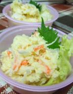 台所に立つ私にまとわりつくのは・・・・もうすぐ2才になるやんちゃな愛娘。エプロンのフリルが気になって仕方ないらしい。 台所に立つ後ろ姿にムラムラしてイタズラしかけようとする彼氏。蚊。・・・もうねー、これからの季節窓を一センチでも開けようもんなら大量の蚊が乱入してくるんですorzかゆいよー。さて、そんな悪環境でポテトサラダに挑戦してみたんですよ。1 玉ねぎ一個を薄くスライス!にんじん半分を細切り!2 子供の拳骨ぐらいのジャガイモを3つに輪切りし、10個ゆでる。3 茹で上がったら皮を剥いて、つぶす。4 すんごい大量の胡椒とマヨネーズ・塩を入れる。5 玉ねぎとにんじんを入れて全体を混ぜる。簡単に言うと、野菜を切って、ゆでて塩コショウとマヨネーズで味付けする。この工程に、驚くことなかれ、1時間半もかかりました。90分!まず、玉ねぎスライスでつまづきました。30分以上はかかったなぁ。次に苦労したのは、茹で上げジャガイモの皮むき。熱いんやもん。これも休み休みで数十分。最後に、マヨネーズ投入時。驚愕の事実が発覚!入れども入れどもポテトに水分を取られるもんの?最終的にチューブの半分ぐらい入れたよー。それでもお店でうっとるみたいななめらかサラダにはならんかった。どんだけ、どんんだけの大量のマヨネーズを入れとるん?!これ以上入れたらカロリー恐いぜ、ってことで今回は適当に切り上げたけど・・・全部の材料を混ぜるときも大変。10個もジャガイモ使うと、デカボウルいっぱいに仕上がったので重いんです。混ざりきってないかも(笑)♪お外でランチ用♪の盛り付けです。あー、もうポテトサラダ作りがこんなに大変だったなんて思いませんでした。(わた・わた・・・私だけ・・・?メインやスープなんて作ろうもんなら夜があけるねw)みなさんの食卓にポテトが並ぶ日があったら、作ってくれた方に感謝して、頂きましょうねさて、皮を剥くのがめんどかったこともあり、皮付きのままバターをちょっと切って、トースターで焼いてみました。これはーーーーーーーーーー!激ウマです。こんなに美味しいと思わなかったので画像はなし。これこそ、簡単。半分に切った皮付きジャガイモにバター乗せて焼くだけ。また食べたいーーーー