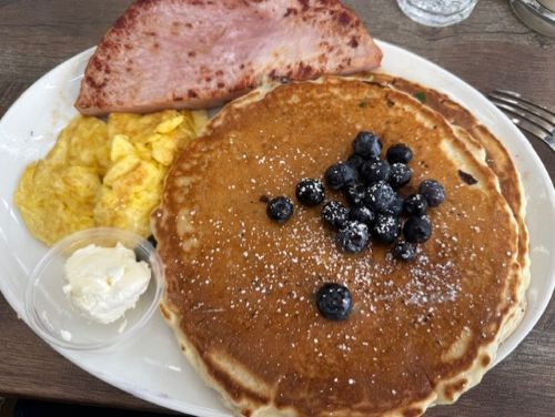 わたしは、朝食セットで、スクランブルエッグと、ハムと、ブルーベリーパンケーキのセット。