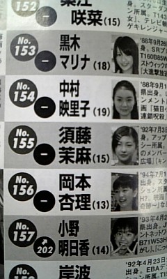 60・・・久住小春(15) 71・・・時東ぁみ(19) 76・・・道重さゆみ(18) 93・・・亀井絵里(18) 95・・・新垣里沙(18) 115・・・菅谷梨沙子(13) 118・・・田中れいな(17) 119・・・嗣永桃子(15) 124・・・夏焼雅(15) 155・・・須藤茉麻(15) 171・・・小川麻琴(19) 253・・・岡田ロビン翔子(14) 264・・・丹羽未来帆(17)