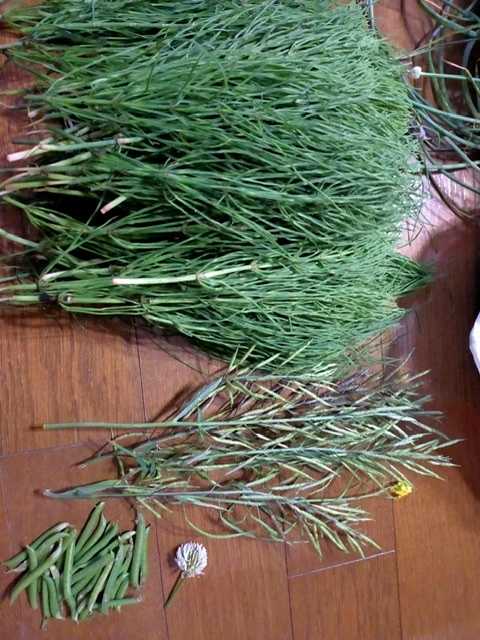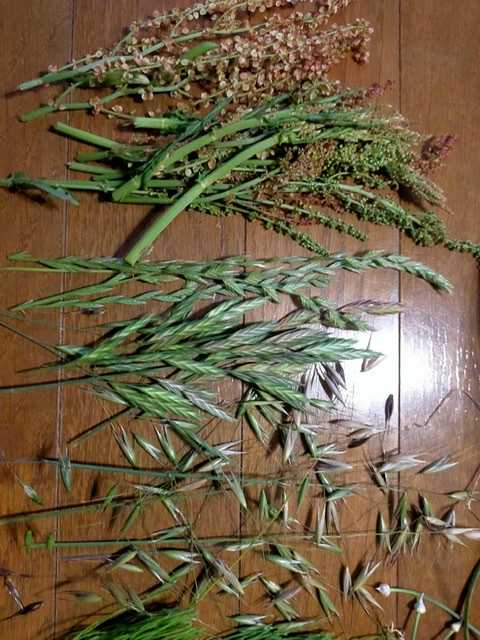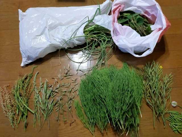 こちらはピヨコ用、ギシギシとかの花芽と、カラスムギ、イヌムギの穂。