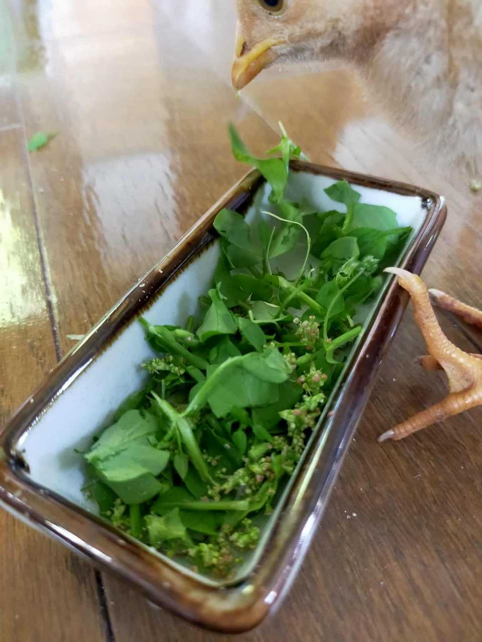 真ん中の太い茎ははずして、細い所を手ごろな長さにちぎってやるんだけど、ガサガサしそうなのに、すごい勢いで食べる。
