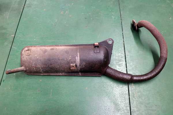 やっとの事で外したエキパイをパーツクリーナーで脱脂を行い、ワイヤカップでサビ落としを行う。後で気が付いたのだが、パーツクリーナーを使うよりは、バーナーで炙って油分を燃やした方が完全に脱脂できたと思われる。次に赤サビ転換剤を塗布して、耐熱塗料を吹いて完成であるが、マフラーカバーが欠品となっているので、何とかしなければ。