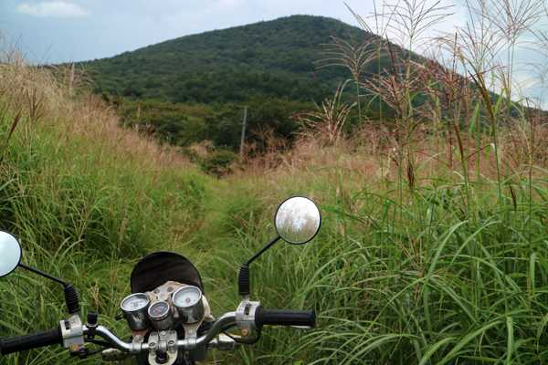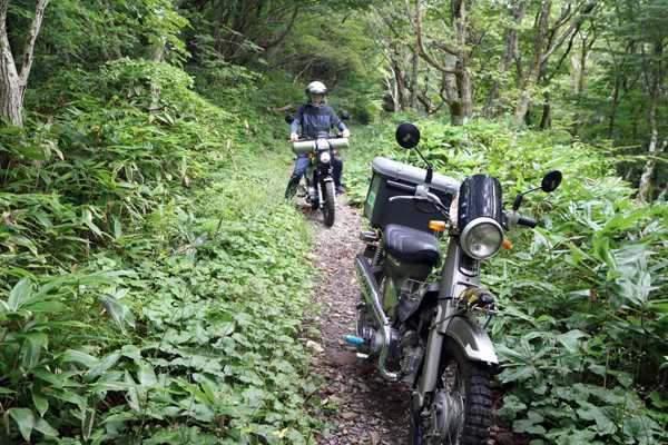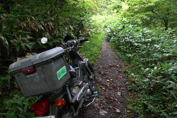 一段落したので、GPS25000の位置情報をONにして付近のオフロードを探してみる。道後山への登山道があったがその前に、キャンプ場の奥のオフロードを下って行くと、草苅がなされた広場で行き止まり、水道施設もあるのでここもキャンプ場だろう。広場はフラットで明るいので、ベースキャンプ地をここに移動する事にして、登山道へ向かう。細いオフロードはガレ場になっているが、何とか走れる。段差で下回りをヒットさせながらも進んで行くと、熊笹が両脇からせり出し、突っ込むとズボンがずぶ濡れになりそうなので、ここでストップ。引き返す事にした。