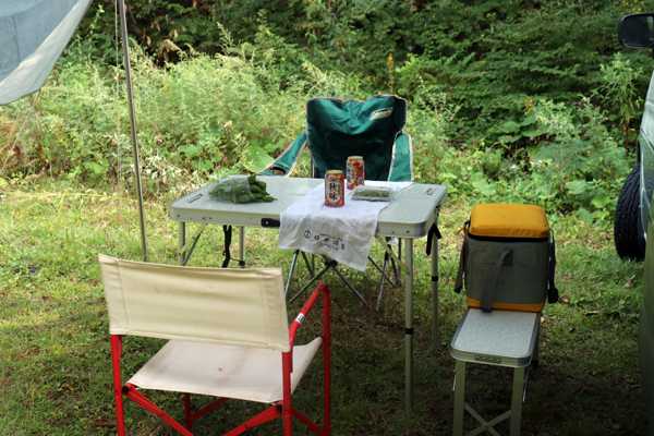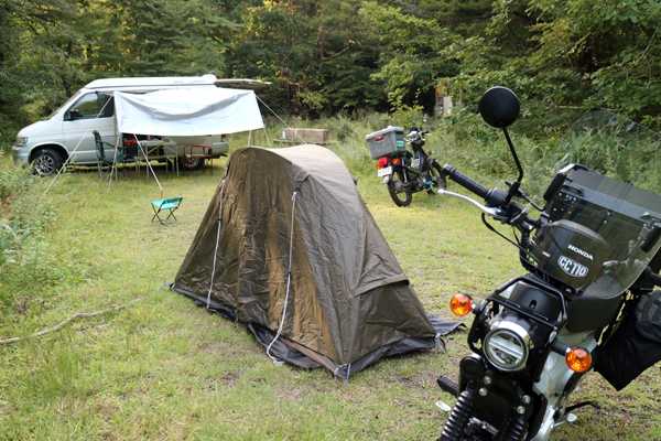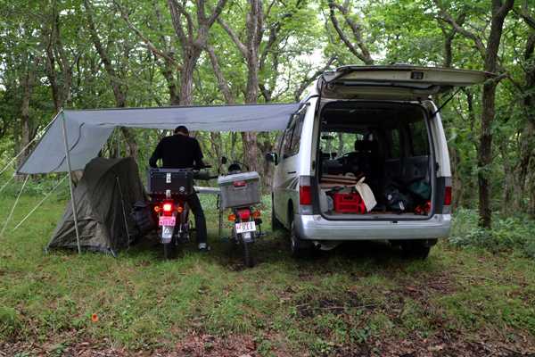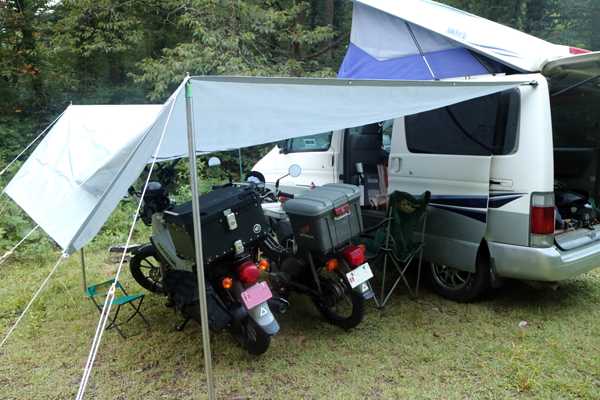 どうやらこのキャンプ場は無料のようなので、早速カブ2台を降ろし、物干し竿とビニールシートで雨よけのサイドタープを設営していたら、通り雨の小雨が降ってきた。タープの下で一服していると、カッパを羽織ったカップルが道後山登山にやって来た。雨は直ぐ止み、空を見上げると曇ってはいるが、雨が降りそうな雲はない。クロスカブさんは悪戦苦闘しながらテントを張っている。