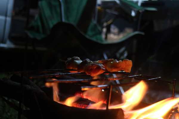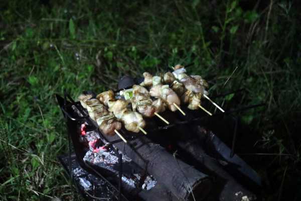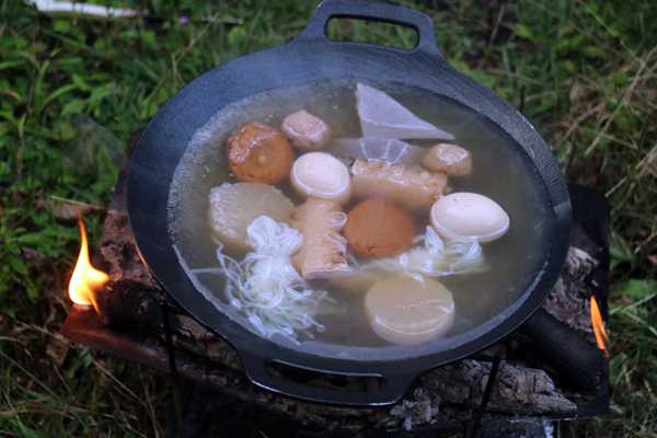 このキャンプ場の標高は1,075mなので曇り空という事もあり、至って涼しい。先ずは枝豆をアテにキンキンに冷えたキリンの秋味で乾杯。クゥ~。こりゃたまらん。続いて高知の酔鯨に移行しつつ、焚き火に掛かる。涼しいので火を焚いても汗は出ない。適度な熾きが出来た所でマルチグリドルを掛けおでんを煮る。酒は既に純米吟醸酒に移行しており、昨夜串を打った串鳥を焼いて行く。これがスーパーの焼き鳥と違って、ジューシーで美味い。