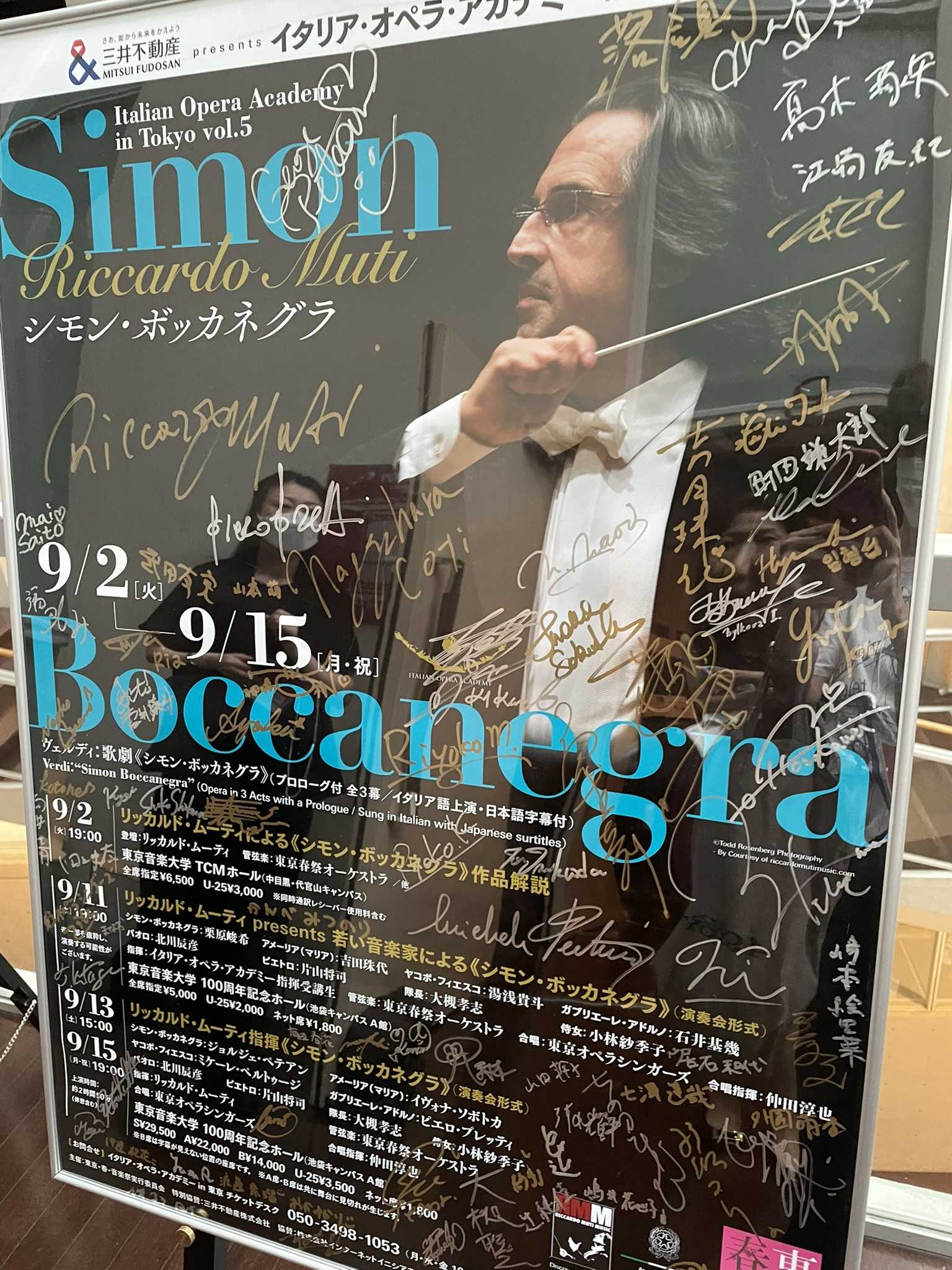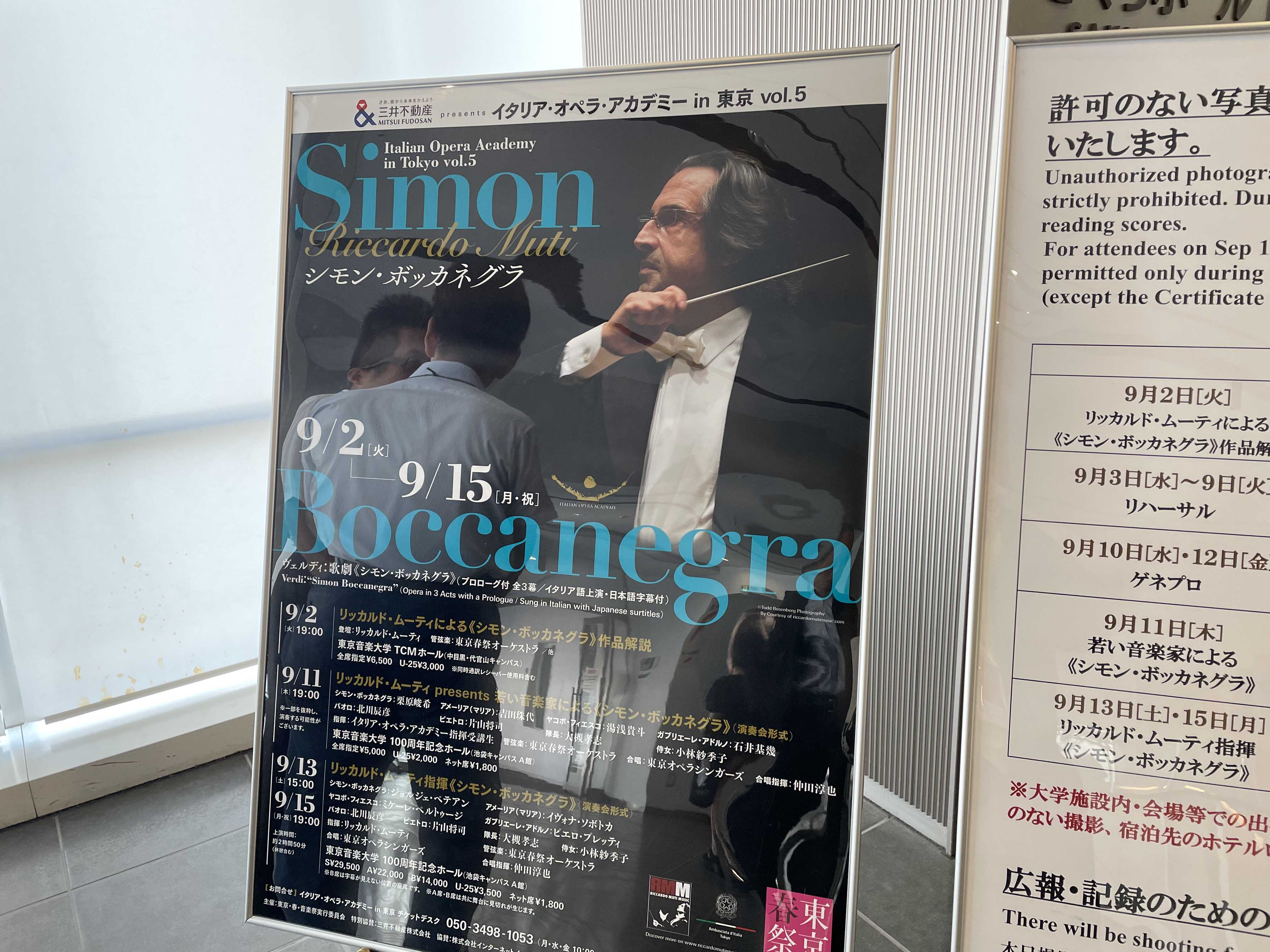 リッカルド・ムーティ指揮《シモン・ボッカネグラ》(演奏会形式)ゲネプロ2025年9月12日 [金] 15:00スタート東京音楽大学 100周年記念ホール(池袋キャンパス A館)指揮:リッカルド・ムーティシモン・ボッカネグラ(バリトン):ジョルジェ・ペテアンアメーリア(マリア)(ソプラノ):イヴォナ・ソボトカヤコポ・フィエスコ(バス):ミケーレ・ペルトゥージ※ガブリエーレ・アドルノ(テノール):ピエロ・プレッティパオロ・アルビアーニ(バス・バリトン):北川辰彦ピエトロ(バス):片山将司隊長(テノール):大槻孝志侍女(メゾ・ソプラノ):小林紗季子管弦楽:東京春祭オーケストラコンサートマスター:長原幸太(NHK交響楽団第1コンサートマスター)合唱:東京オペラシンガーズ合唱指揮:仲田淳也ヴェルディ:歌劇《シモン・ボッカネグラ》 (プロローグ付 全3幕/イタリア語上演・日本語字幕付)上演時間:約2時間50分(休憩含む)***ムーティ指揮シモン・ボッカネグラゲネプロ昨日で終わりじゃなかった。昨日指揮受講生指揮による本番があり一つのヤマは超えた。しかし、オケと合唱にとっての試練はこれからだった。むしろここからが本気の戦いだ。指揮台に立つムーティは今までと打って変わって怖しいQuale orror! 大暴れ誰よりもエネルギッシュマンマミーアと嘆息したりバスクラ!と怒鳴ったり。ピアノ!と怒鳴ったり。まさに帝王ムーティの本領発揮。受講生に足を動かすなとしつこく言ってた割には、ご本人は地団駄踏んだり、蹴ったり、大暴れ。もっともっととヴァイオリンのヴィブラートを煽る。俺を見ろ!誰一人目を離せないムーティの棒で全てが表現される海のさざなみまで。プロローグのヴァイオリンが海の波が寄せるさまを表現する。これはすごい!顔を覗き込んで至近距離でフォルテのタイミングを振られたらもう〜たまりません絶叫するソボトカ。会場には昨日本番を終えた受講生や日本人歌手の姿も。彼らにとってもまだアカデミーは終わっていない。オケ音量を上げたり下げたり忙しいMo. Muti昨日(おととい)までとはまったく違う音楽がそこにあった!ほんとすごいです。第1幕のフィナーレで、はりきって立ち上がったぺテアンに、まだ早い、座れ、と指示するMo. Muti。ぺテアン苦笑い。オケが見えなくなるからあまり早く立ち上がって欲しくないようです。Mo. Muti、ソロ奏者の顔が見えないと怒ります。1幕フィナーレまで終わって休憩Mo. Muti:Benissimo, bravo!Mutiは頭上の集音マイクの影がアメーリアの顔にかかると言って位置を直させる。舞台監督さん大忙し。25分の休憩後第2幕、第3幕をやってゲネ終了やっぱり海外招聘歌手たちが底力を発揮してすばらしすぎる!ペテアンの声が美しい!ペテアン前回日本でシモン歌った時も、ドミンゴの声に似てるなーと思ったんですが、やっぱりほんのちょっと似てます。最後の方の死ぬ前の演唱テンポがめちゃめちゃゆっくりでさすがでした。ペテアンの息の長さ 馬力はとんでもない 美しい歌唱をレガートで響かせます。イタリアの至宝バス、ペルトゥージさん、お声がノーブルですごく響いて広がりがあります。やはり世界最高峰のバス。ソボトカはやはりワグネリアンソプラノ並みのパワーでありながら情熱的に美しく歌えてすばらしいです。テノーレのプレッティさんもリリコスピントで強靭かつ美しい声。歌心があって表現力に長けてる。重唱の中で立ち上がるリリコスピントの声が本当にカッコいいです。普通明日が本番だと歌手は多少セーブすると思うのだが今日はやはりMutiさんの前だからか皆さん100%だったと思います。合唱の難しいアクセント付けて歌う部分も返させてました。とにかく合唱がすごい!美しくかつ正確で大迫力。最後はムーティさん Benissimo 出ました。いよいよ明日ムーティ指揮シモン・ボッカネグラの本番一日目です。