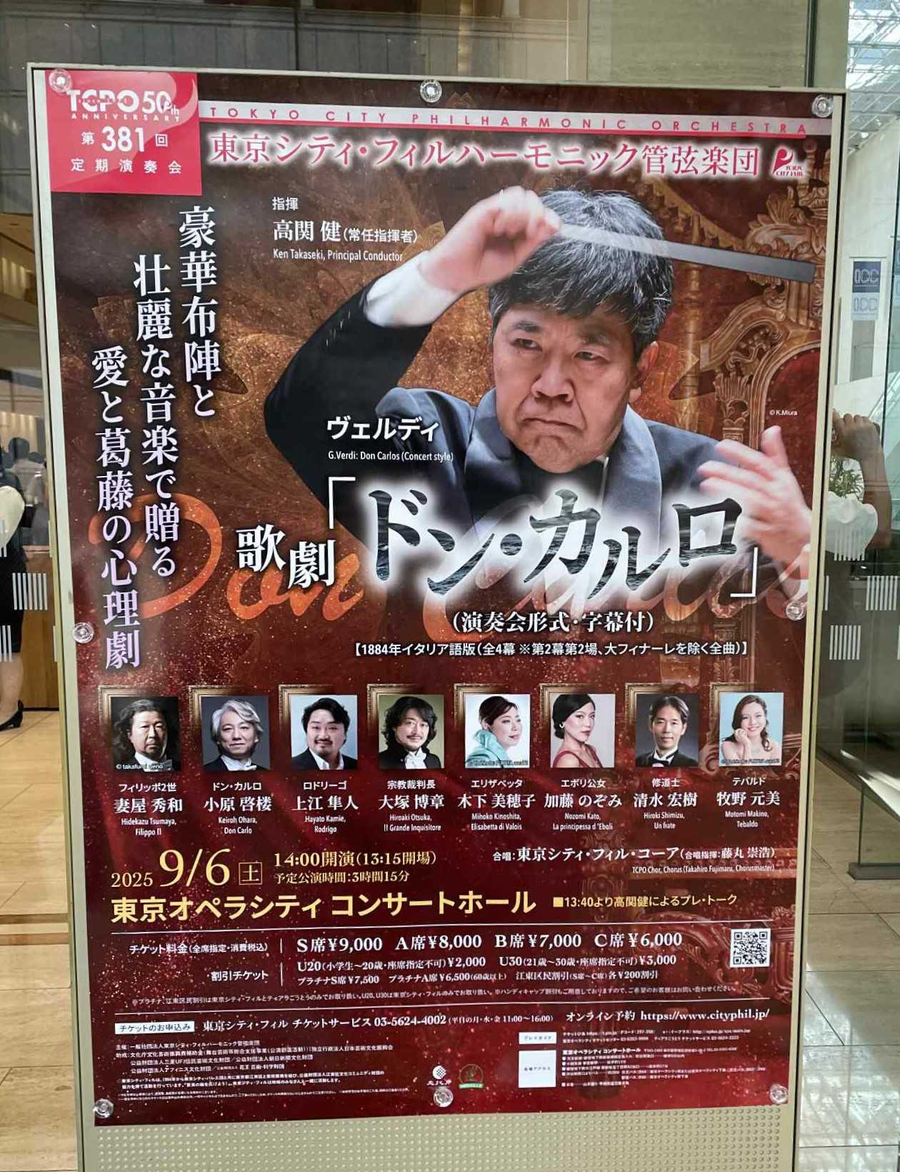 東京シティ・フィルハーモニック管弦楽団第381回定期演奏会ヴェルディ:「ドン・カルロ」(演奏会形式2025/9/6 (土) 14:00開演東京オペラシティ コンサートホールヴェルディ:歌劇「ドン・カルロ」(演奏会形式・字幕付) 【1884年イタリア語版(全4幕 ※第2幕第2場、大フィナーレを除く全曲)】※予定公演時間 3時間15分指揮:高関 健(常任指揮者)フィリッポ2世:妻屋 秀和ドン・カルロ:小原 啓楼ロドリーゴ:上江 隼人宗教裁判長:大塚 博章エリザベッタ:木下 美穂子エボリ公女:加藤 のぞみ修道士:清水 宏樹 テバルド:牧野 元美レルマ伯爵:新海康仁合唱:東京シティ・フィル・コーア(合唱指揮:藤丸 崇浩)***東京シティフィル「ドン・カルロ」今回の上演はなんと丸々火刑の場カット!信じられますか?終わって話してたのですが、あれじゃアイーダで凱旋の場カットするのと同じことでしょ?予算の関係でカットだったそうですが、それなら「ドン・カルロ」をやってはいけません。ありえません。それに東京オペラシティでドン・カルロはできません。ステージに乗りきらないし金管(ホルン)が客席に近くてうるさいったらない。歌手はステージにいたつきにするべき。出入りの靴音がうるさくってしょうがない。そんな中好演したのはエボリの加藤のぞみアグネス・バルツァと絶賛している人いました。ドンファターレはちょっと絶叫し過ぎかと思ったが、このパワーを見せてこそオペラ !ヴェールのアリア高音は胸音で処理大変な力技。見事でした。オケはムーティさんが言っていることと全て真逆をやっていた。ムーティさんの言葉「ヴェルディはレガート書いてなくてもレガート「ピアニッシモですよ「スタッカート強調しないで、喜劇じゃないんだから「下品にバーってやってはいけないetc. etc.…なかなか勉強になりました。お疲れ様でした。