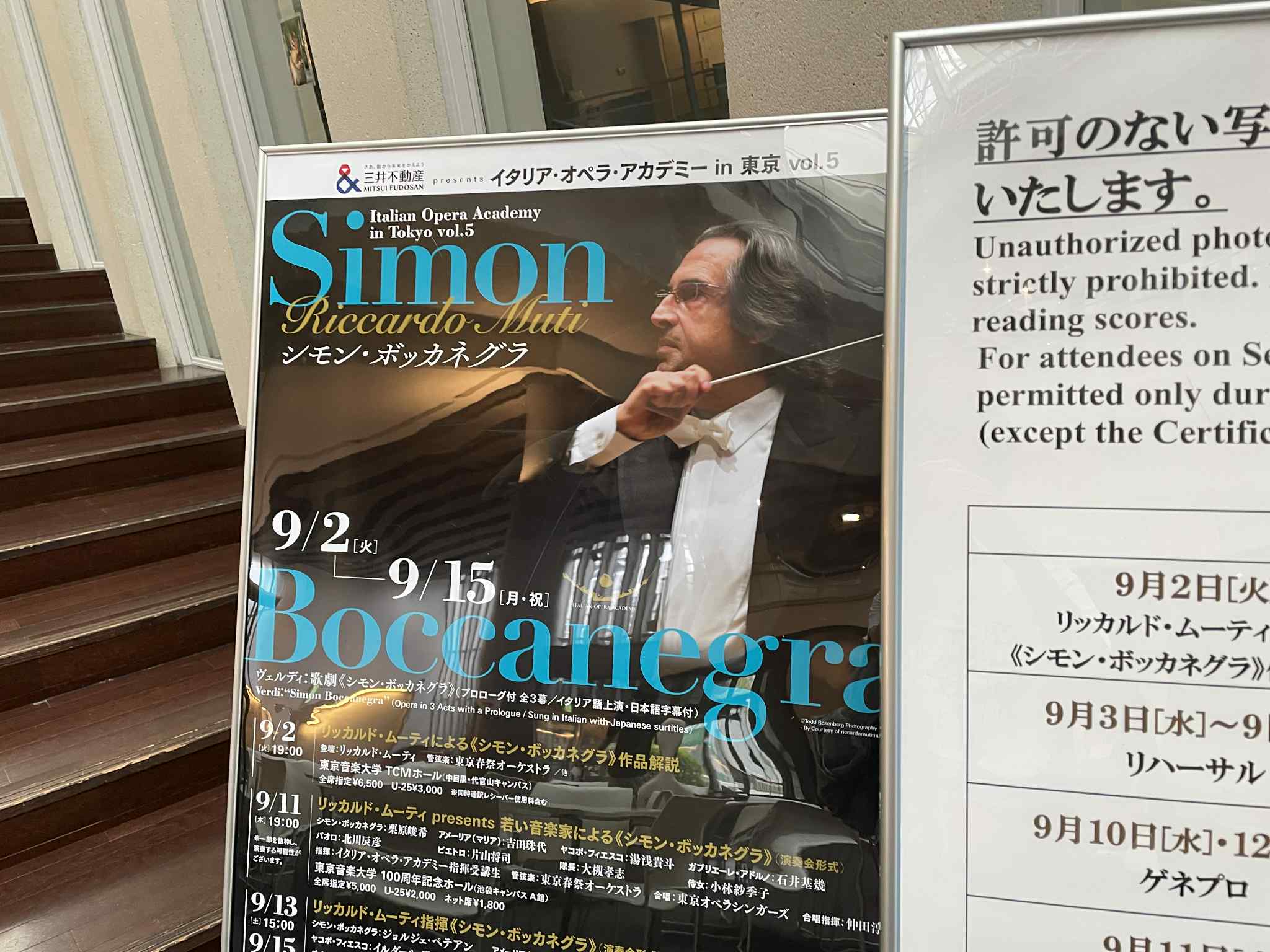 Riccardo Muti Italian Opera Academy in Tokyo vol.5 "Simon Boccanegra"三井不動産presentsリッカルド・ムーティ「イタリア・オペラ・アカデミー in 東京」 vol.5 《シモン・ボッカネグラ》リハーサル・Day3【Rehearsal Day3】Orchestra Soloist Rehearsal / Chorus Piano Rehearsal 2025年9月5日(金)東京⾳楽⼤学 100周年記念ホール(池袋キャンパス)講師:リッカルド・ムーティRiccardo Muti==指揮受講生==■ヒョンソプ・リム Hyungsup Lim■ウェイ・リン Wei Lin■町田謙太郎 Kentaro Machida■ジェイコブ・ニーマン Jacob Niemann■佐藤瑛吾 Eigo Satoシモン・ボッカネグラ(バリトン): 栗原峻希 ジョルジェ・ペテアン George Peteanアメーリア(マリア)(ソプラノ):吉田珠代ヤコポ・フィエスコ(バス・バリトン):湯浅貴斗ガブリエーレ・アドルノ(テノール):石井基幾パオロ・アルビアーニ(バス・バリトン):北川辰彦ピエトロ(バス):片山将司隊長(テノール):大槻孝志侍女(メゾ・ソプラノ):小林紗季子管弦楽:東京春祭オーケストラコンサートマスター:長原幸太(NHK交響楽団第1コンサートマスター)合唱:東京オペラシンガーズ(合唱指揮:仲田淳也)合唱ピアノ:松本康子 (仲田淳也様にご教示いただきました。「合唱担当のピアニストは松本康子さんでした☺️《アイーダ》《アッティラ》に続きマエストロの公演でご一緒しています。」とのことです。ありがとうございます。)同時通訳:??? 河原義ステージ上通訳:田口道子***朝から台風の接近が心配される中予定通りスタート。オケリハは昨日止まったところから昨日こだわっていたトロンボーンに件の箇所を演奏させてベーネ ベニッシモと褒めるさすがMutiさん!優しい途中で道子さんをステージに呼んでオケに通訳させて大演説。オペラをやりたいなら劇場を歌手を知れと檄を飛ばす。ラストまでやってあまりの美しさに涙を禁じ得ないのだがMutiさんは「直すところがたくさんある」と。一般聴講者の中には譜面台を立ててリコルディのスコアを置く人もいて本格的。若い人はiPadでスコアを見ている。マエストロのレッスンを聴講できるのは、正直これは世界最高レヴェルの喜びです。まさにMuti教信者に私もなってしまった。午後からはなんとペテアンさんが登場!栗原さんが都合が悪いということで代わって歌った。世界最高のリリック・バリトンでヴェルディバリトン!すばらしいお声Mutiのローマ歌劇場の来日公演ですでにタイトルロールを演じているのにMutiさん遠慮なくダメ出しさすがいきなり世界レベルになってクラクラです。ピエロ・プレッティさんも会場に来てました。夜の部は合唱リハこれがまたぶっ飛びのすばらしさ。Mutiさんもベニッシモ連発Mutiさん、合唱褒め殺しでした。Bravoマエストロと仲田さん?を讃える納得です。泣くほど美しい合唱これはやばいです。それに連日長丁場のマエストロMutiが合唱もきちんと自ら指揮&指導しててすごいと思いました。受講生には合唱は振らせなかったのです。***※以下はメモをもとに、ムーティ氏の言葉を中心に一部概要を記載。Day3(オケのソリスト付きリハ)Atto2 E FからMo. Muti:(オケのメンバーが)新しいですね。 E♪~トロンボーンだけでお願いします。(昨日散々やったところの返し)2小節目にディミヌエンドあります。とてもいいです(と褒める) ずっとピアニッシモです。F♪~ Andante (violin のさざ波のところ)Mo. Muti:はねるようにではなくて。violinだけで。3,4回やりましょう。トップのパート大きくして。♪~Mo. Muti:ではアクセントなしで。♪~Mo. Muti:Bravo, benissimo. 忘れないで、眠っているというフレーズ。G♪~Mo. Muti:(指揮者に)(ガブリエーレ:Figlio d'Adorno!~)最後の3小節振らなくていいです。 オケだけでアレグロ・アジタートから。ヴィオラとチェロ、マルカートで。絶対的にインテンポで。I♪~ガブリエーレ:Suo padre sei tu!!!Mo. Muti:(テノーレに)ここ、3時間じゃないですよ。