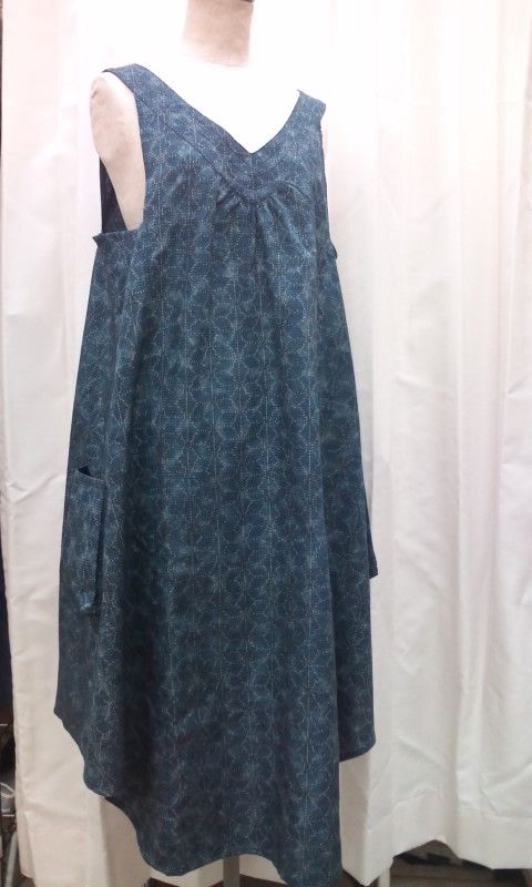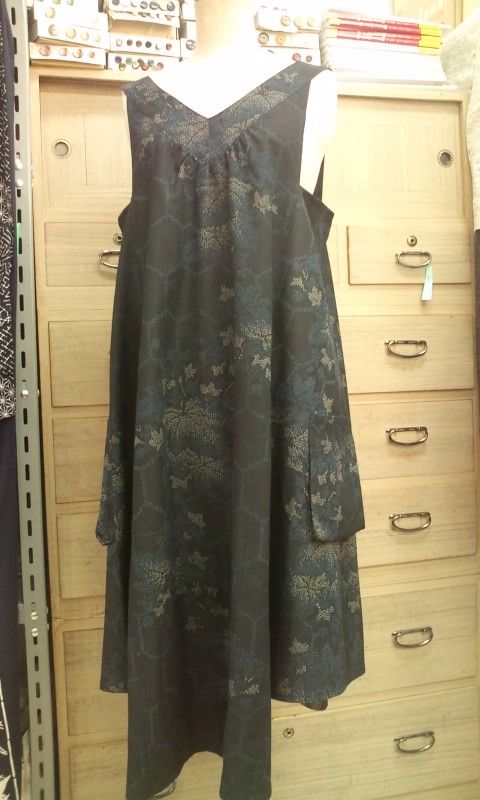 今月も2カ所、展示即売会へ参ります。5月12日(金)・13日(土) @デポー町田5月26日(金) @デポー国分寺国分寺へは久しぶりの出展です。サンプルは全て一点物ですので、お早めにどうぞ。ヴォーグ社のリメイク本に掲載したこの変形裾ジャンパースカートは、ご注文が多く、定番となりつつありますが、サンプルを購入される方が多い為、しょっちゅう柄が入れ替わっています。前回2月の町田展示会記事で紹介した扇柄も、すぐに売れてしまいました。今回仕立て上がりのものは、黒地の紬です。青の亀甲柄に、白でぼかしのかかった蔦の葉が織り出されています。遠くから見ると亀甲がレンガのようにも見え、葉脈のグラデーションが控えめでとても素敵です。