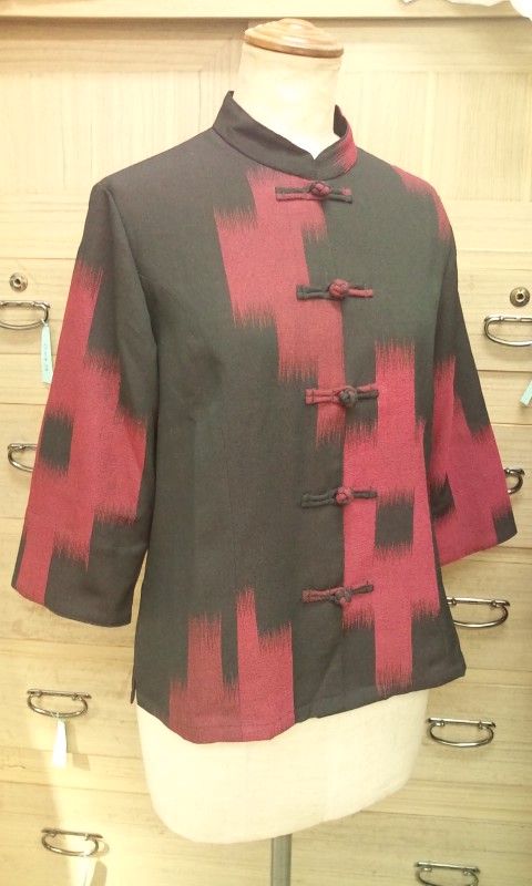 定番の七分袖チャイナブラウス大きな絣柄のモダンなお召しで仕立ててみました。しぼがあるのと、黒地にピンクがかった赤が、ちょっとカジュアルで、着やすいのではないでしょうか。8/27(月)東村山店舗お休みしますご予約は042-306-2442syjuntan@hb.tp1.jp