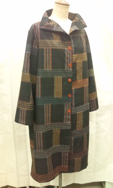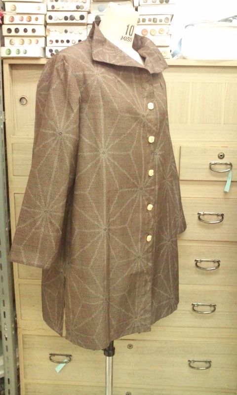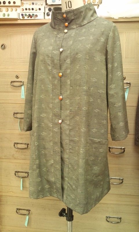 1月30日(火)・31日(水)デポーせたがやにて展示即売・受注会です。年末年始で少し展示の間が空きましたので、新作をたくさんお持ちできそうです。欠品していた前たてコート、できました。シックなお抹茶色の絣柄紬、とても良い生地です。ビンテージの足つきボタンを色違いでつけてみました。サンプルはすべて一点物ですので、お早めにどうぞ!