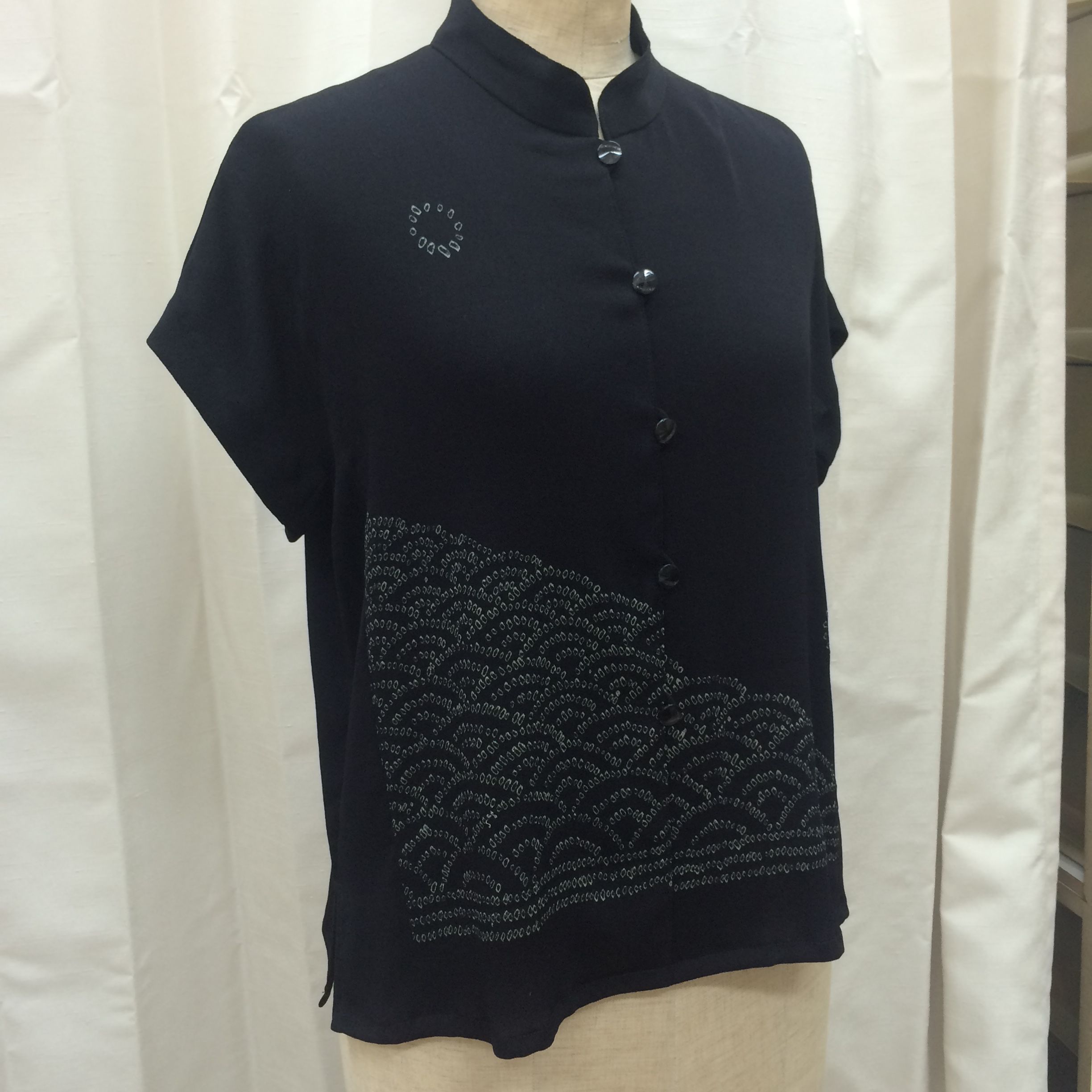 縮緬に鹿の子絞りで青海波の端柄の入った、男物の兵児帯を、女性用のブラウスにお仕立て直ししました。柄が両端の二ヶ所しかないので、柄合わせと生地巾の接ぎ合わせに工夫が必要でしたが、綺麗に入れる事が出来ました。袖底にマチをとった、動きやすいフレンチスリーブで、小さな衿のマオカラー。ダーツはあまりとらずに、流れるように落ちる生地のやわらかさで身体に沿います。残った端切れはほんのひと掴みでした。9月10日(月)店舗お休みしますのでお気を付け下さい。ご予約は042-306-2442syjuntan@hb.tp1.jpまで