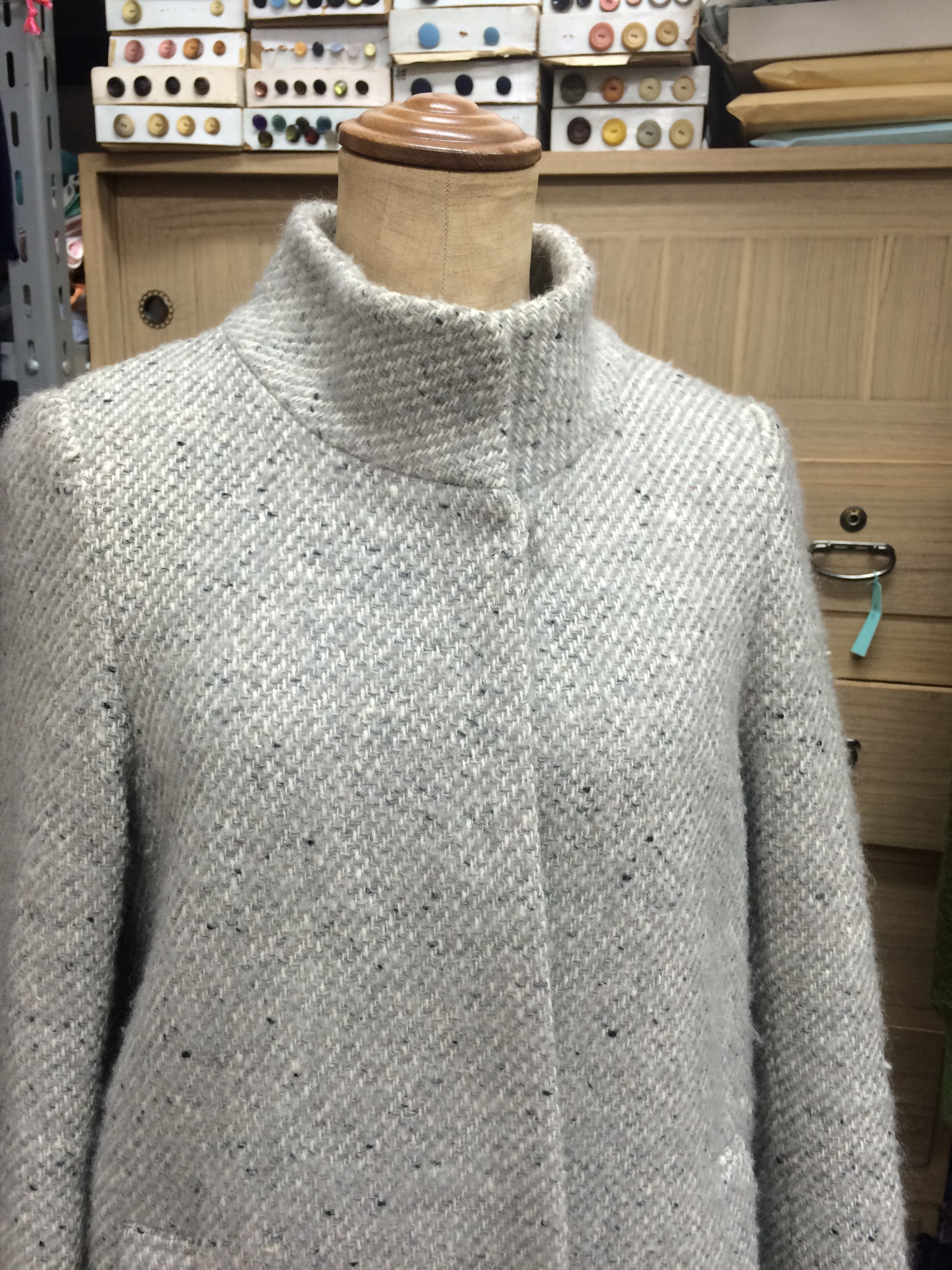 スタンドカラーのウールコート、衿を外して、ラウンドネックのノーカラーに直しました。見返しも、外した衿から裁ち出しています。※12/14(金)・22(土)は東村山店舗お休みですので、お気を付け下さい。ご予約は、042-306-2442syjuntan@hb.tp1.jpまで。年末は12/29(土)まで、新年は1/7(月)から営業致します。