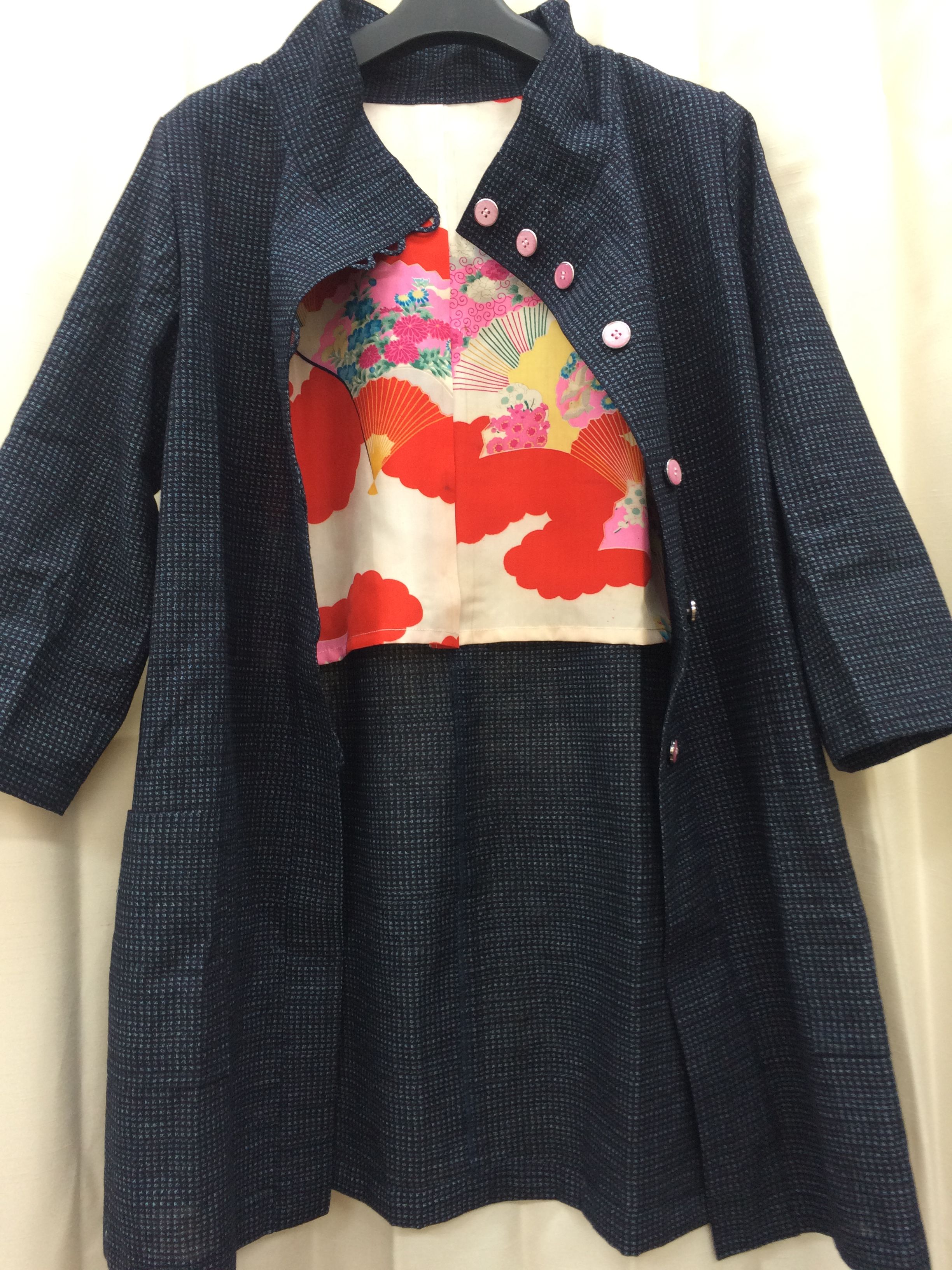 5月17日(木)・18日(金)デポーせたがやへ、展示即売・受注会に伺います。薄くて軽くて、さっぱりとした絣地で、定番の前たてコートを仕立てました。表地は木綿ですが、裏はシルクの羽二重で、着物らしい赤や桃色が華やかな、雲地に扇柄の羽織り裏を使っています。傷みがあって表には使えなかったので、綺麗な所を選んで、短い背裏になりました。**19日(土)・21日(月)は東村山店舗お休みします。ご予約は042-306-2442まで