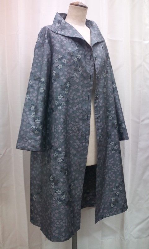 かなり透ける、明石地の端切れで、お洋服からのパターン取りでお仕立てです。濃紺地に、青っぽい花柄が入っている、シャッキリとした生地です。小さなキズが多く、どうなるかと思いましたが、あちこちやりくりをして、どうにか、お客様ご希望の袖丈とスカート丈をキープしたまま、仕立て上がりました。2/18(月)は、ご予約対応のみとなっておりますので、お気を付け下さい。ご予約は042-306-2442まで