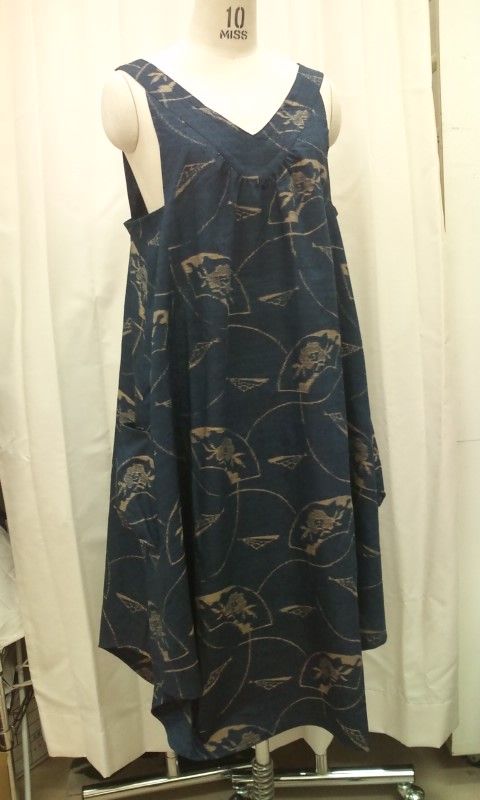 きものリメイクサンプルの展示即売・受注会に伺います。6月23日(土)・24日(日)デポー国分寺こちらの変わり裾のジャンパースカート、日本ヴォーグ社のリメイク本に掲載したオリジナルパターンですが、着こなしやすく、対応サイズも幅広い為か、サンプルお買い上げも人気、ご注文も多い定番となっております。紺地に扇が大きく散っている、しっかりした紬で仕立てています。触れば着心地の良さがわかります。すべて一点物です。**展示会当日は、東村山店舗はサンプル不在となりますお問い合わせ、ご予約はお気軽にどうぞ。042-306-2442syjuntan@hb.tp1.jp