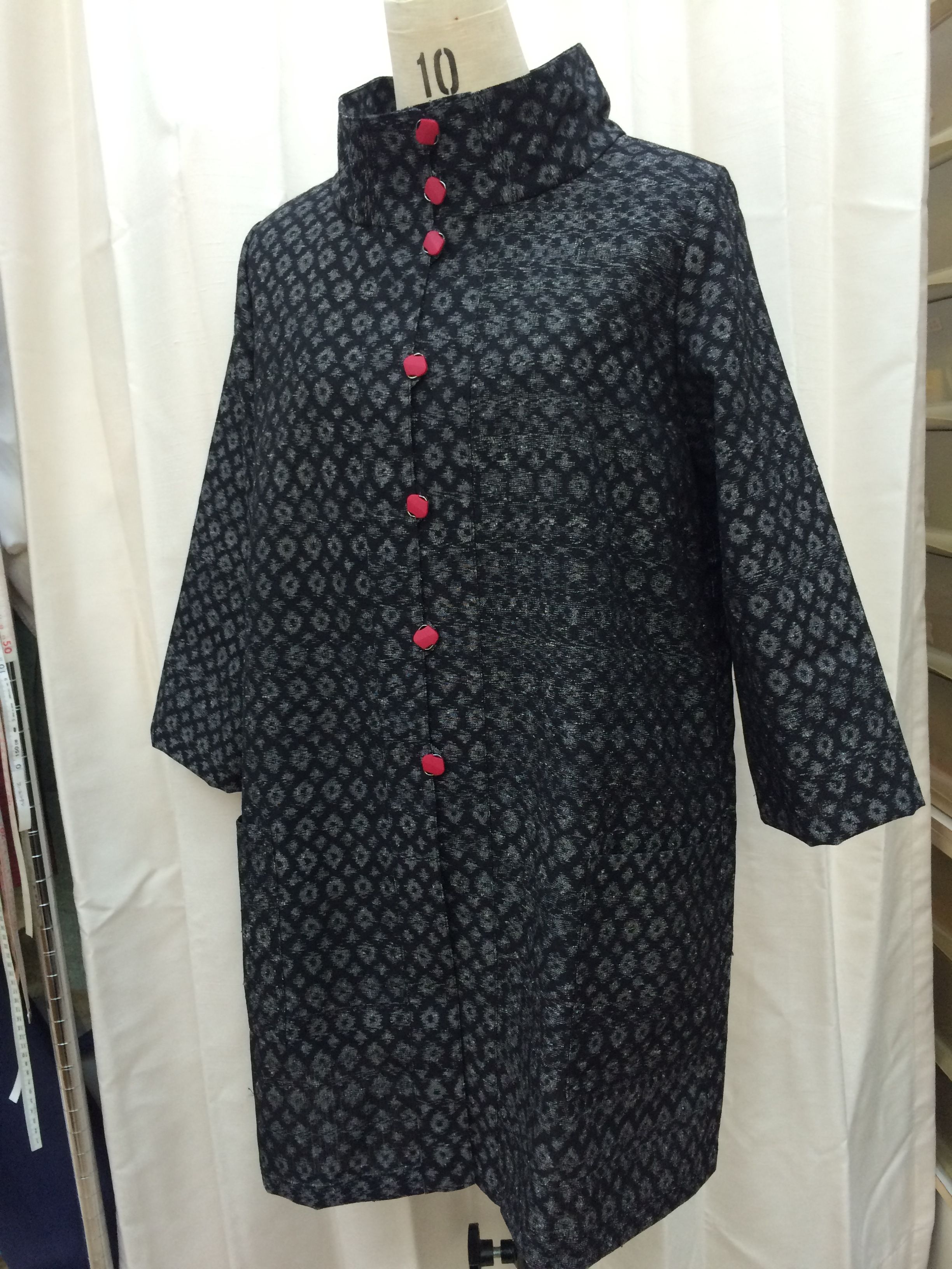 2月17日(土)・18日(日)@デポー八王子みなみリメイクサンプルの展示即売・受注会に伺います。仕舞ったままのお着物、羽織り等、お持ちください。サンプルはすべて一点物、ご試着いただけますのでお気軽にどうぞ。こちらも定番になった前たてコートです。生地はしっかりした黒のウール地で、琉球絣の銭玉(ジンダマー)に似た絣柄が入っています。躑躅色のボタンをアクセントにしました。2月10日(土)、20日(火)は東村山店舗お休みします。