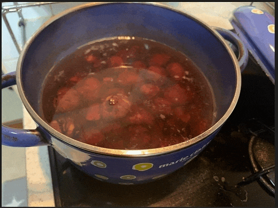 重曹を加えて弱火で静かにゆでます。重曹を加えるとアク抜きになり、早くやわらかく。栗が重ならないように大きめの鍋がおすすめ。