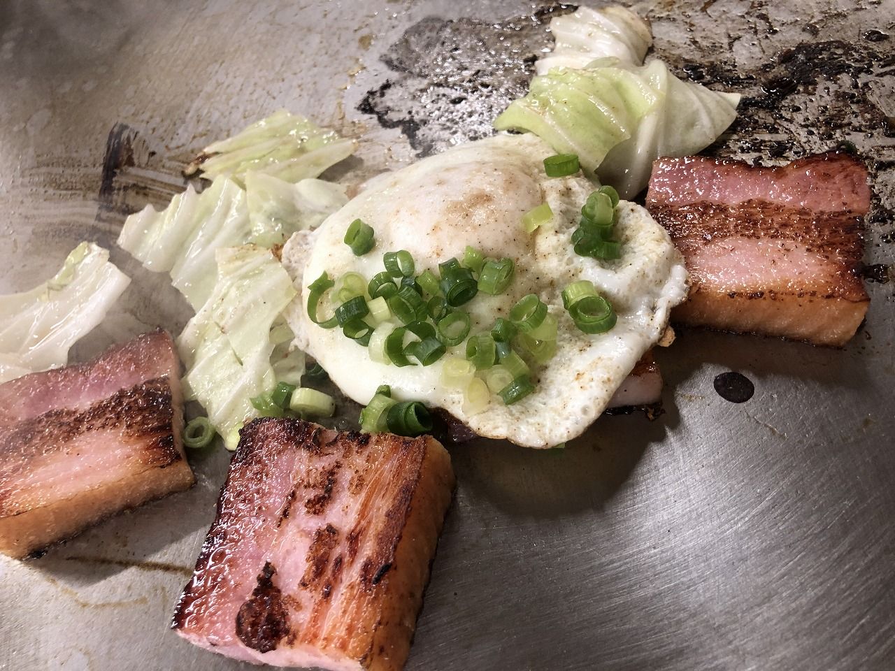 厚切りベーコン焼き!目玉焼きが乗っけてもらえるのが、お子ちゃまのひー様にとっては嬉しい限り!?