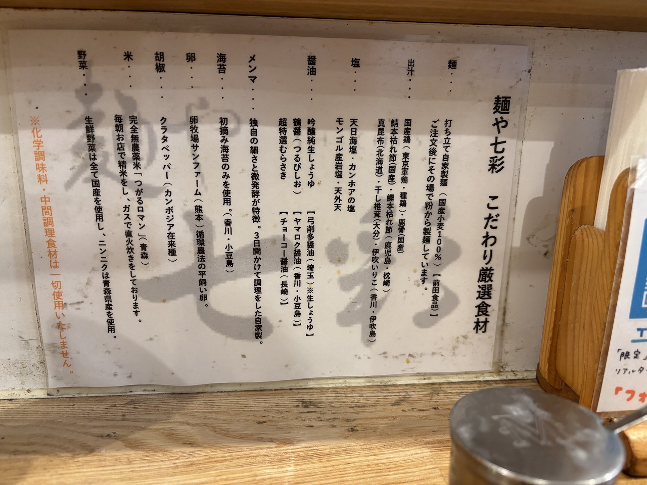 ラーメン待つ間、こだわりの材料を見てみますと・・・・・全て国産の材料!?
