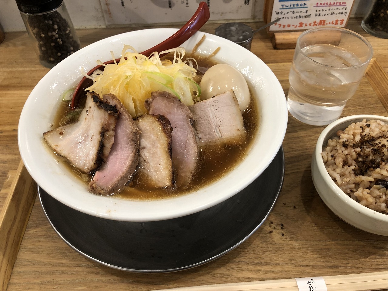​確かに特製!?分厚い2種類のチャーシュー!煮卵に味付けネギは申し訳程度ではなく、しっかりスープの中まで大量に入れてありました!ご飯は別に玄米ご飯(200円)を注文!合計1,950円!​