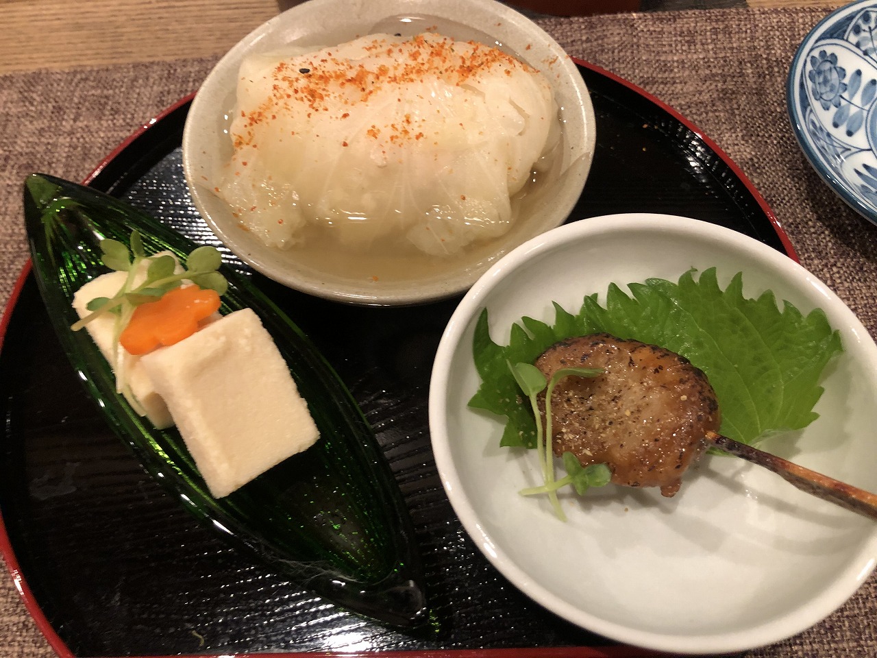 おばんざい3種盛り450円。つくね、高野豆腐、ロールキャベツです。