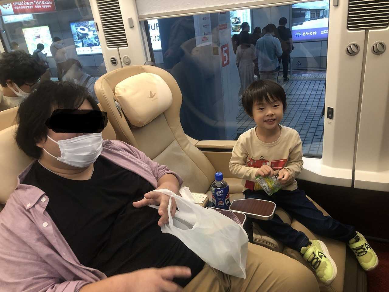 座席はプレミアシートです。ふみふみの横に座っているおデブは、ふみふみの従兄弟です。