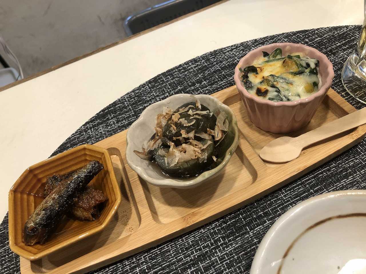 生ビールとおばんざい3品のセット。ニシン、茄子、ほうれん草のグラタン。
