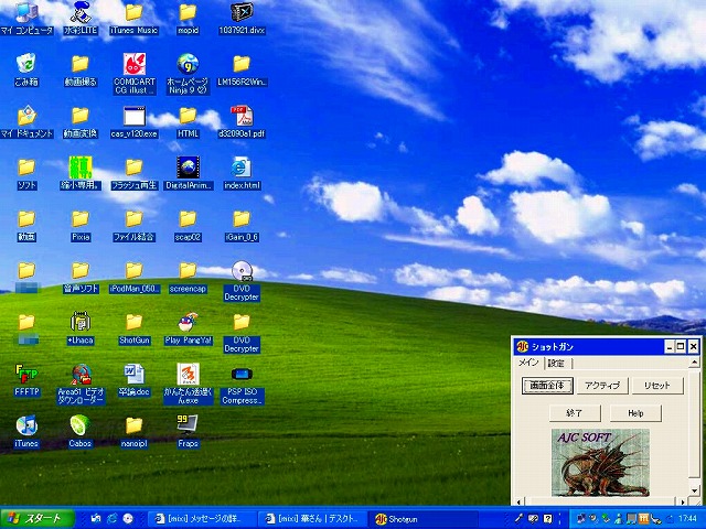 主に4つの内容です。長いのでスルー推奨(ぁ1つ目今日宮島にマラソンしてきました。ん?これで終わりですがなにか?ww2つ目。昨日コンクラさんと交流会をしましたー正直翔謙は昨日はPC自分共に調子が悪く散々な結果に終わりましたがすごく楽しかったのでおkkちなみに通算HIOがやっと70本に到達です。100本目は1週間くらい先かな?で、コンクラでのないようですが、そのときいなかった朝霧ろり。もといるりさんについての話題で盛り上がりましたwコンクラのマスターJINさんが猛烈にるりさんを所望してましたwそしてあちらのクラブの朝霧さんも「あの個性は自分に必要」とのこと。あのーいるならもってっちゃってくださいww多分るりさんなら「えー私のカラダはお高いよ?」って言いながらも着いて来てくれるはずですwですよねるりさん?(ぉ3つ目。蒼羽さんのとこからのバトン。しーくれっとバトンです。>01 アリス兄貴かなー>02 みんな。 >03 んーるりさん(ぉ >04 蒼羽さん、あずきさん、なやかやさん>05 ざっすー(ぇ>06 男のマイミクみんなw >07 該当者なしw>08 みんなじゃない? >09 最近なやかやさんと。 >10 ん?そりゃもう蒼羽さんとアリス兄貴しか(マテ >11 さとみつさん>12 るりさんw >13 いないかなぁ? >14 なんかそんなイメージはない >15 上に同じ>16 るりさんとかw >17 あずきさん、蒼羽さん、アリス兄貴 >18 アリス兄貴。近所のお兄さん系(ぉ>19 んーつくねさんかなぁ?>20 なってくれるなら誰でもござれw >21 つくねさん >22 アリス兄貴だねw >23 るりさん >24 これまたるりさん >25 ダントツでアリス兄貴。対抗に蒼羽さん >26 蒼羽さん。日記にも結構ファッションのこと書いてあっておっしゃれな感じ。>27 諸事情によりスキップw>28 パンヤでならラブクーの方大半。 >29 るりさん。いつもエンジン全開。 >30 いや、おれにはもったいないです><>31 ゲイじゃないのでw>32 アリス兄貴。年近いしねw >33 蒼羽さん、あずきさん。 >34 んーわからん; >35 蒼羽さん。たまに日記に書いていることを見る限りでは。 >36 アリス兄貴。パンヤでならなおさら。>37 なやかやさん(ぉ>38 すいません、おれです>< >39 いないかな? >40 さつkさんからー >41 さぁ? >42 そんなこと言われても。。。 >43 アリス兄貴。おれと趣味がかぶるとこがあるからw>44 いや、知らないけど女性の方はそうなんじゃないー?>45 なやかやさん!暖かい感じがする>46 いないっぽ >47 逆に食べそうな人ならいますがw >48 それがるりさんw >49 最近つくねさんのプレイに萌えます(ぇ >50 アリス兄貴。すきありそう>51 アリス兄貴、蒼羽さん、なやかやさん、あずきさん みんな頼れるかな?>52 いないかなw >53 蒼羽さん。普段温厚なので逆に。 >54 るりさん。特に年。>55 アリス兄貴 >56 上に同じww >57 るりさん >58 なんかこの質問なかった? >59 蒼羽さん >60 依存までじゃないけど蒼羽さん活用多いね。疲れたorzでもまだあるんだよねw最後華さんのことからです。■ルール■ これを見た人は、必ずデスクトップのスクリーンショットを日記に載せます。執行猶予はありません。 あまりに名誉毀損だという場合には、アイコンやファイル名に修正を加えてかまいません。 しかし、あまり修正しすぎるとおもしろくないのである程度自粛しましょう。 (歴史は常に模造と偽造の歴史である、よって修正を加える) 早速すべてのウィンドウを最小化しましょう。 ■あなたのデスクトップを晒して、一言どうぞ。 もうちょっとまとめろって感じw■OSは何? ウィン XP ■これはあなた個人のパソコン?職場や家族共有のパソコン? 家族共有。だから壁紙もまじめなのしか・・・w ■この壁紙は何?どこで手に入れた? デフォ ■壁紙は頻繁に変える? 全然変えないw■デスクトップのアイコンの数はいくつ? めんどくさいから数えてww■ファイルやショートカットがゴチャゴチャしているデスクトップ、許せる? 許せないけど自分がそれ。かといって片付けるとどこにいったかわからないから現状維持。■何かこだわりはある? よく使うプログラムは必ずショートカット作る。 ■今回、このバトンが回ってきてからこっそりとデスクトップを整理した? んにゃ、そんなめんどくさいことやらないねw ■バトンくれた人の壁紙の感想は? なかなか使いやすいんじゃなーい?■最後に『この人のデスクトップを覗きたい』人を挙げてね。 んー、アリス兄貴とか見てみたいかもあとあずきさんとか蒼羽さんとかはどんな感じか想像つかないから見てみたいですねーwはい、今日のブログ終了。長いぜこりゃあ・・・w