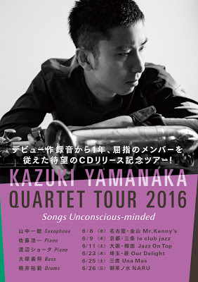 是非聴きたいと思っていた山中さんのライブ。タイミングを逸して、11月の「東京行灯祭~Tokyo Lantern Festival~」以来になってしまったが、期待通りの骨太なアルトサックス(時にソプラノサックス)であった。NYへ戻るらしいがそれまで未だライブがあるらしいので、また参戦したい。NYで山中さんが恩師Jon Faddisさん(Tp)に言われた、「それ行け、攻めろ」の言葉通り、全編で「ぶち壊す」迫力。Sonny RollinsばりのHard bopバリバリの破壊力。勿論、Hard bopばかりでなく、「10.Stella by Starlight」のようなバラードでは囁くような優しいフレーズも。大塚さんのベース、桃井さんのドラムも普段通り、素晴らしい出来。山中千尋さんのトリオで5回くらい、桃井さんのドラミングはお聴きしており、今日のメンバーでは最多回数ライブでお聴きしている。佐藤さんのピアノはライブでは初かも。ただヒタスラ美しかった。纐纈歩美さんともライブされているので、近々また佐藤さんのピアノ聴きたいと思った。 << 2016 Jun 26th 山中一毅4@ 御茶ノ水NARU >>sax山中一毅 4 p佐藤浩一 b大塚義将 ds桃井裕範1st1.Today's Blues: Blues 0626162.TA-KE-YA-BU3.Portrait Of Midnight4.Do I Have A Blues?2nd5.Let Go - 恩師Jon Faddisさん(Tp)に言われた、「それ行け、攻めろ」の意味6.New-Risky Dream7.New-Hydrangea - 日本語の紫陽花、昨日は王子で美しい紫陽花を見たとのこと8.Lexington At 50th Street- NYでバイトで働いていた寿司屋でフレーズが思いついた、その場所3rd9.Vertigo-gt松原慶史さん、ts寺井雄一さんも加わったセッション10.Miles Davis "Stella by Starlight" -gt古市 響平さんも加わったセッション11.Prayer (Remembering March 11th)12.HAMABE-NO-UTA -Song Of Seashore- 『サマータイム』 『テネシー・ワルツ』 『イパネマの娘』 『ベサメ・ムーチョ』 『黒いオルフェ』 『マイ・フェイバリット・シングス』 『シャドウ・オブ・ユア・スマイル』 『スマイル』
