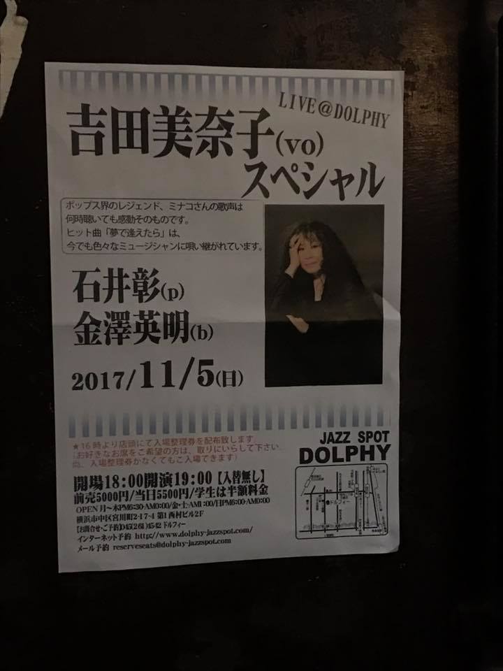本日は吉田美奈子さんトリオを聴きにDolphy参上。入場整理券ゲットのために並び中。結構寒〜い❄️😨チケット🎫をゲットしてからDolphyに入れるまで2時間以上あったので行きつけのバーガー🍔ショップへ。将棋の第30期竜王戦第3局をAbemaTVで観戦。羽生棋聖が渡辺さんの竜を叱りつける99手目3八金に対する100手目同竜が渡辺竜王の怒涛の攻めで羽生棋聖の玉を追い詰める。17時7分、攻防ともに見込み無く羽生棋聖投了。感想戦。渡辺さんの72手目3四金が疑問手で3一歩打と待つのが最善だったが、羽生さんの次の8二銀がより疑問手。78手目の5二飛からは形勢に差がつく。ここまで見てDolphyに向かう。今日は8月にピットインで聴いたミナコジカナならぬ美奈子さん、石井さん、金澤さんで「ミナイシカナ」のトリオ。美奈子さんのJAZZボーカルの良さを引き出す、イシカナのお二人。昨年4月のDolphy、8月のピットインに比べても回数を重ねたこともあってか、美奈子さんの魅力がより強烈に炸裂。ピットインよりもDolphyの空間がコンパクトなこともあるかも知れないが。 << 2017 Nov 5th 吉田美奈子(vo)スペシャル@横浜Dolphy >>吉田美奈子(vo)/ 石井彰(p)金澤英明(b)1st1.インスト〜「パリの空の下〜アコーディオン弾き」のメドレー。金澤さんと石井さんの深淵な世界。2.Come Sunday〜熊本震災チャリティーCD@ピットインから。石井さんの素晴らしいアレンジ。3.Summertime〜金澤さんと美奈子さんのDuoから。過ぎ去りし夏に愛惜を籠めて4.Oh, Danny Boy〜石井さんと美奈子さんのDuoから。渋谷毅さんのオーケストラで初めて歌って今では自信を持って歌えるようになったとのこと。前は縄跳びでどこから入って良いか難しかったとの事。5.What Are You Doing The Rest Of Your Life?〜8/23のミナコジカナ@ピットイン以来、Stacey Kentバージョンで300回は聴いて修練したので美奈子さんと一緒に小声で歌う。笑6.Footprints〜Wayne Shorter。インストでも中々聴けないこの曲を美奈子さんボーカルで満喫。2nd7.インスト〜「ワルツステップ/富樫雅彦」。軽快かつ繊細で美しい。「裏二重奏」の神髄。8.Goodbye Pork Pie Hat〜Charles Mingusの曲にJoni Mitchellが作詞。Lester Youngが愛用し、彼のトレードマークだったのがPork Pie Hat。9.Cry Me A River〜石井さんとのDuoから。10.Stormy Weather〜Etta James11.Over The Rainbow〜Stomy Weatherと一対の組曲12.翼〜武満徹13.Everyday I Have The Blues〜B.B.King<< 2017 Nov 5th/ NHK FM セッション2017 >>-二見勇気SKY TRIO-「C Jam Blues」 (2分43秒)「Straighten Up and Fly Right」 (7分00秒)「I Concentrate on You」 (8分05秒)「Just in Time」 (8分16秒)「For All We Know」 (6分46秒)「Come rain or Come shine」 (8分55秒)「Cakewalk」 (7分52秒)ピアノ…二見勇気ベース…金子健ギター…井上智