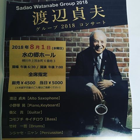 << Sep 2nd 2018(Sun)深夜 - '渡辺貞夫 Nightly Yours'@FM東京>>「Monthly Live~渡辺貞夫グループ2018サマー・ツアーPart1」8月2日の福岡県築上町のステージ◆「Passing By」◆「Naturally」 ◆「Train Samba」 演奏メンバー◆アルト・サックス~渡辺貞夫◆ピアノ、キーボード~小野塚晃◆ギター~養父貴◆ベース~コモブチキイチロウ◆ドラムス~竹村一哲◆パーカッション~ンジャセ・ニャン参考までに、このメンバーの別府ライブのセットリストは以下の通り。<< Sep 5th, 2018// 渡辺貞夫と子どもたち Share The World in BEPPU 2018@別府国際コンベンションセンター ビーコンプラザ フィルハーモニアホール (大分県)>>1st:13:59-14:571.A FELICIDADE2.PASSING BY3.NATURALLY4.SANGOMA5.ALALAKE~LOPIN'6.EARTH STEP7.TEMBEA8.WATER COLORS9.TRAIN SAMBA2nd:14:57-15:4410.SHARE THE WORLD11.風のゆくえ12.ESCOLA JAFRO PERFORMANCE13.黒い瞳14.YES, I'M IN LOVE15.SHARE THE WORLD(Up Tempo)16.NA LAPA17.花は咲く18.ENDING:黒い瞳Enc:15:45-15:5519.CHEGA DE SAUDADE20.BLUE ‘N' BOOGIE