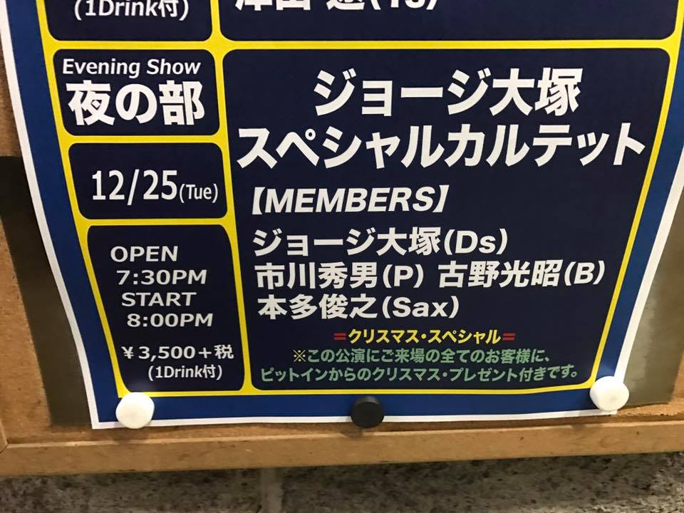 今日はジョージ大塚さんカルテットを観にピットイン参上。クリスマスライブで華やかな本多さんのアルトが炸裂。<<2018 Dec 25th ジョージ大塚(Ds)カルテット@新宿ピットイン >>ジョージ大塚(Ds)市川秀男(P)古野光昭(B)本多俊之(Sax) 1st1.If I Should Lose You2.Wayne Shorter - Footprints 3.Dindi - Tom Jobim。ピアノトリオで 4.?- ピアノトリオで 5.Winter Wonderland6.Straight, No Chaser 2nd7.MINHA SAUDADE-JULIAN "CANNONBALL" ADDERLEY 8.The Christmas Song9..?- ピアノトリオで 10.Mercy, Mercy, Mercy! - Cannonball Adderley 11.Someday My Prince Will ComeEnc12.?Freddie Freeloader
