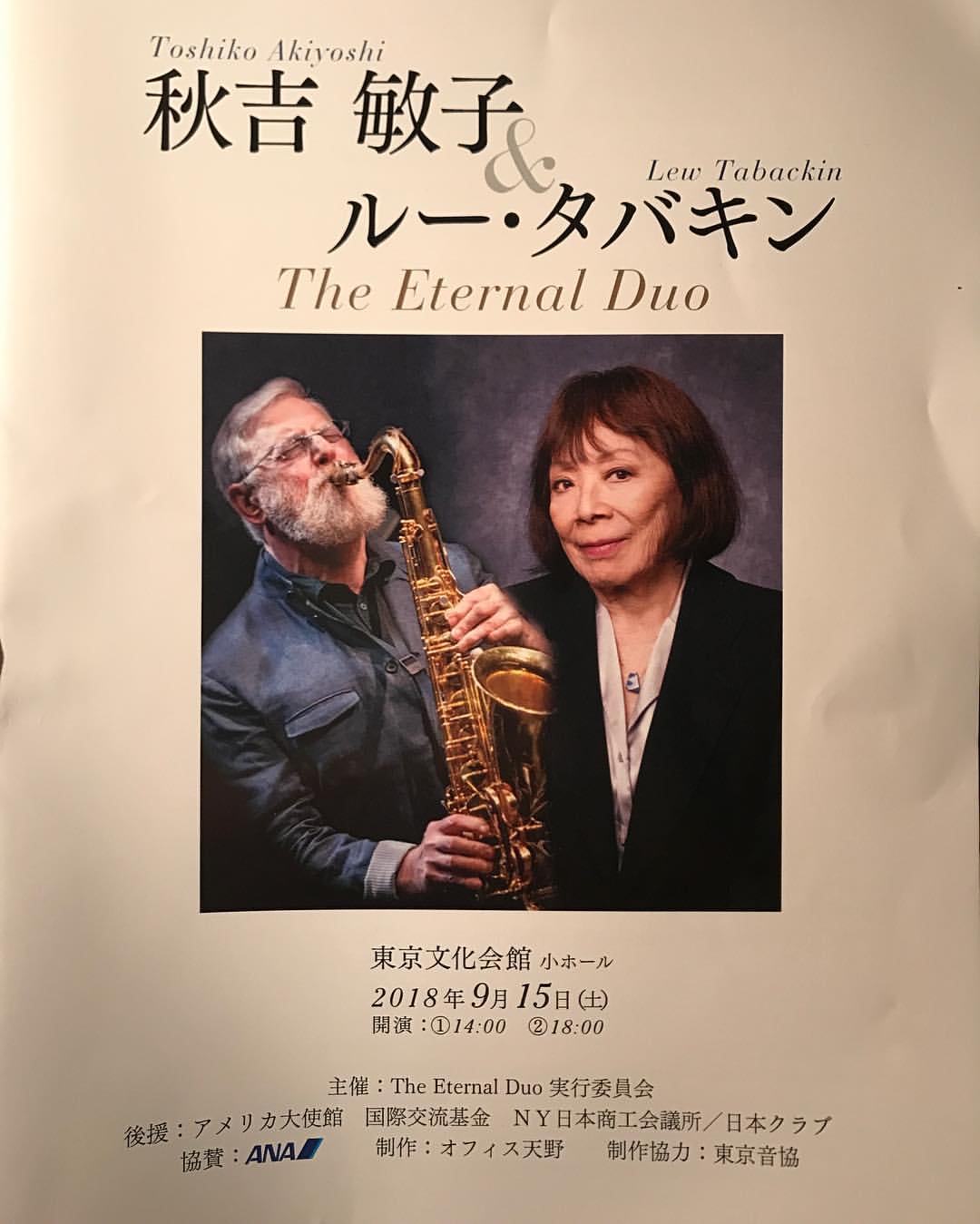 << NHK BS 2018 Jan 6th深夜 DUO 50年 穐吉敏子&ルー・タバキン「永遠のデュオ」@東京文化会館小ホール 2018/9/15(土)より >>1.Long Yellow Road-穐吉さんオリジナル1960, ルーさんts2.Tales of a Courtesan-花魁譚(おいらんたん, 穐吉さんオリジナル1975), ルーさんfl3.Body&Soul-ルーさんtsでソロ4.The Village(Kisarazu Jinku)-穐吉さんソロ(穐吉さんオリジナル1971)5.Autumn Sea-穐吉さんオリジナル1978, ルーさんfl、雅楽「春の海」にInspiredされた、雅楽の「音が曲がる」イメージ6.Eulogy(賛歌)-Tribute to Duke Ellington 1999 by Toshiko Akiyoshi, ルーさんts, 雅楽とEllingtonのサウンドを融合させた7.Lady Liberty-穐吉さんオリジナル1986、組曲「Lady Liberty」より第3楽章、ルーさんts8.HOPE<希望>-穐吉さんオリジナル2001、長い曲「ヒロシマーそして終焉から」のエピローグ、広島で演奏してNYへ帰ったら9.11が起きた、ルーさんtsEnc9.月の砂漠-穐吉さんソロ10.Hanging Loose-穐吉さんオリジナル1979、ルーさんts11.Take the 'A' train-Billy Strayhorn1939、ルーさんts