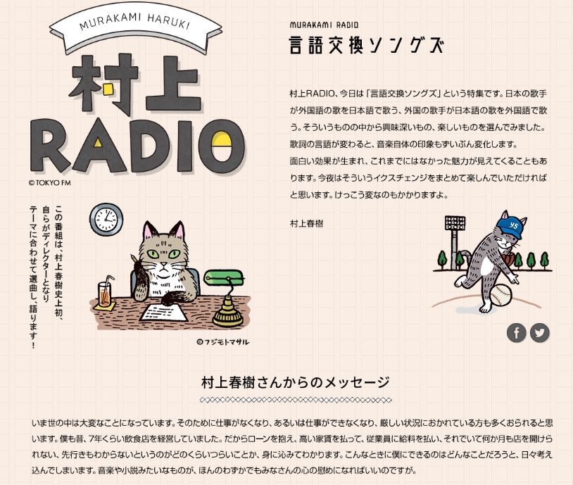 今の世の中を何とか勇気付けようという春樹さんの気持ちが籠った~言語交換ソングズ~特集。「Yozora No Mukou」(スガシカオ原作)を青山のジャズクラブで綾戸智恵さんがすぐ目の前で熱唱されるのを聴いた経験があるらしい。迫力があってソウルフルで、とても素敵だったとのこと。「4.真心ブラザーズ-My Back Pages」では川本三郎の自伝的小説「My Back Pages」、それを原作とする妻夫木君主演の映画を思い出す。真心ブラザーズ特有の「直球勝負」の歌詞は衒いもなく、清々しい。青春の一断面をvividに描き出す。「6.スキヤキ」のための歌詞を春樹さんが書いたことがある。「上を向いて食べよう、シラタキがこぼれないように」っていう、、、、。洒落ですな。<< Apr 26th 2020(Sun) - '村上RADIO~言語交換ソングズ~'@FM東京>>1.One Big Wave-Timothy B.Schmit-Mid-Summer Blossoms3 Sony Records-桑田佳祐さんの『忘れられたBig Wave』2.Fish-Jeffrey Foskett-The Best Of Jeffrey Foskett-Pioneer-山下達郎さんの『踊ろよ、フィッシュ』3.Yozora No Mukou-綾戸智恵-Life EWE Records-スガシカオさんの名曲『夜空ノムコウ』(作詞スガシカオ・作曲川村結花)4.My Back Pages-真心ブラザーズ-Masked And Anonymous: Music From The Columbia-ボブ・ディランの“My Back Pages”5.浜っ子伝説 (RADIO EDIT)-王様『浜っ子伝説~ビーチボーイズ日本語直訳メドレー』ファンハウス6.Sukiyaki(上を向いて歩こう)- Bobby Vee 30 Big Hits Of The 60's Liberty7.Ashitaga Arusa(明日があるさ)-Inner Circle-ダ・カヴァーズ?イッツ・ダ・ニュー・ベスト Wea8.ROMANCE-坂本龍一-Beauty- Virgin-スティーブン・フォスターの名曲「金髪のジェニー」を沖縄音楽風にアレンジ9.Sho-Jo-Ji (The Hungry Raccoon)-Eartha Kitt-Eartha Kitt BEST SELECTION-RCA-童謡「証城寺の狸ばやし」(作詞野口雨情・作曲中山晋平)10.We Can Work It Out(猫山さんと羊谷さんも参加しています)-The Beatle Barkers-The Exotic Beatles - Part One -Exotica Records11.Trois Gymnopedies-The Camerata Contemporary Chamber Group-Eric Satie; Gymnopedie #Ⅲ #Ⅱ #Ⅰ-Deramついでに、以下の2つの番組も拝聴した。春樹さんがかつて経営していたというJAZZ喫茶のお店に入ったような気になった。笑 「世界の終りとハードボイルド・ワンダーランド」的に表現すると「僕は世界の時空が揺らぐその空隙を潜り抜けると、京王線のある駅から徒歩数分の其のJAZZ喫茶に辿り着く。抗えない引力を感じる。やれやれ。このまま身を任せるしかないか。」<< Feb 16th 2020(Sun) - 村上RADIO 第11回 ジャズが不得意な人のためのジャズ・ヴォーカル特集@FM東京>>1.Madison Time-Donald Fagen2.I Could Write A Book-Arthur Prysock, Count Basie-Richard Rodgers, Lorenz Hart3.Go Away Little Boy-Butler LaVerne4.Monk's New Tune-Michael Franks5.I've Never Been In Love Before-Lorez Alexandria6.Billy Rose's Diamond Horseshoe, the More I See You: The More I See You-Mack Gordon7.The More I See You-Chris Montez8.Lover's In New York-Diane Hubka9.You Inspire Me (Album Version)-Curtis Stigers10.Winter Wonderland-Sonny Rollins;Mickey Roker;Bob Cranshaw<< Feb 23rd 2020(Sun) - 村上RADIO 第12回 ジャズが苦手な人のためのジャズ・ヴォーカル特集@FM東京>>1.The New ABC-Lambert, Hendricks & Ross-High Flying-ソニー2.The Telephone Song-Astrud Gilberto-イパネマの娘 スタン・ゲッツ・ボサ・ノヴァ・イヤーズ-ユニバーサルミュージック クラシック3.It's A Pity To Say Good-Night-Ann Burton-Some Other Spring-Lob4.Take Five-Carmen McRae-休日音楽 Sweet And Jazzy-SONY MUSIC JAPAN5.When You're Smiling-Billie Holiday-ビリーとレスター~ジャズ・ストーリー~-SME Records6.When You're Smiling-リー・コニッツ-Tranquility-Verve Records7.Norwegian Wood-Kurt Elling-The Gate-Concord Jazz8.Early Autumn-Anita O'Day-The Verve Years 1957-1962-Not Now Music9.Parisian Thoroughfare-カリン・アリソン-From Paris To Ri-Concord Records10.Light My Fire-Lisa-Embraceable-スパイス オブ ライフ11.L-O-V-E-Gregory Porter-Nat "King" Cole & Me-Blue Note12.Loving You-Roland Kirk-The Return Of The 5000 Lb. Man-Warner Bros. Records