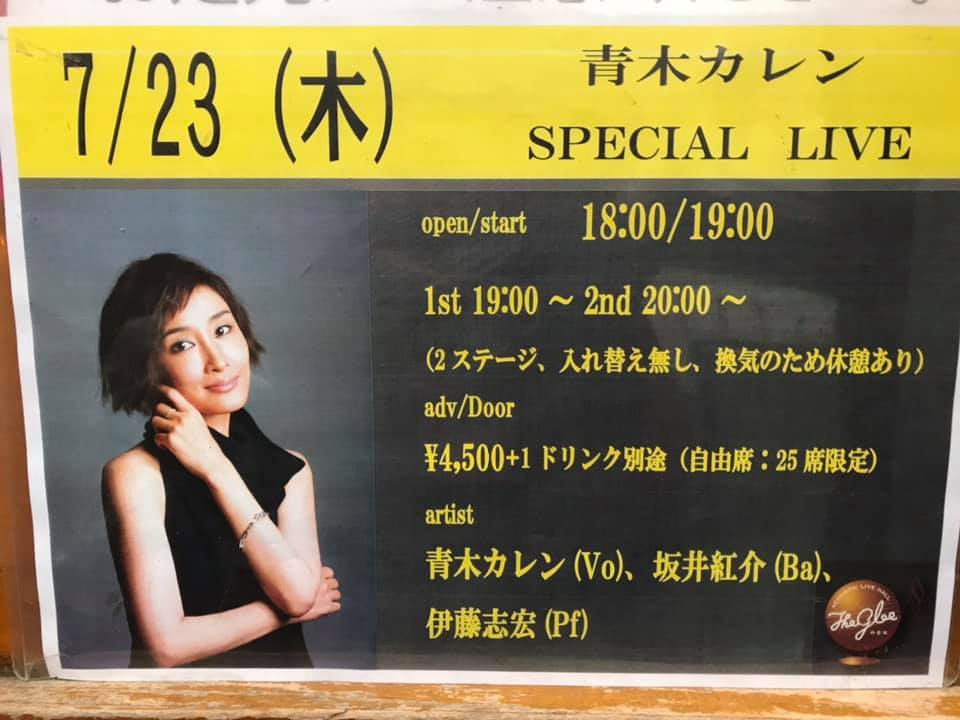 カレンさんのライブは<< 2020 Jan 21th Tue/KAREN & TANABE BIRTHDAY LIVE WITH SHIKOU@神楽坂 TheGLEE >>以来、約半年振りの参戦。と思ったが、<<2020年2月8日 Sat 青木カレン(vo)+Beautiful 5@広尾プラザ2F>>も参戦していたので、約5か月振り。広尾プラザの時は、世の中、JAZZライブがこのような仕儀になってしまうとは想像出来なかったが、ライブは一期一会。今日は健康にカレンさんのライブを楽しめたことを神様に感謝したい。志宏さんのライブスケジュールのアーカイブを見ると、3/14の「小倉 Live & Dining Bar Casablanca」での志宏さんとのライブ以来カレンさんご自身も約4か月振りの久々のライブだったようだが、志宏さん曰く「今までと全く変わらない」ボーカルでブランクは全く感じられない、迫力のライブ。志宏さんと最近ライブされた、たなかりかさん、Shihoさんが「久々でちゃんと歌えるか不安」と言われたそうだが、ライブが始まるとお二人とも「普通に歌っていた」そうで、カレンさんも至って「普通」。笑1stはカレンさんのライブで定番の「1.Gee, Baby Ain't I Good To You」、「2.It Don't Mean A Thing (If It Ain't Got That Swing)」から。Akiko Jazzさんも「It Don't Mean A Thing (If It Ain't Got That Swing)」はライブ頭に歌われる曲で、何となく安心するライブの立ち上がり。切ないバラード「3.Cry Me A River」を挟んで「4.My Paradise」、「5.虹の向こう側」とカレンさんのオリジナル曲。9月にはカレンさんの新曲がリリースされるそうで、楽しみ。gt 田辺充邦さんとのDUOアルバム「mellow」から「6.Charade」。聴いていて全く分からなかったが志宏さんには不満足なリブがあったようで、すかさず紅さんがそのリブを弾かれたのは流石の「パイセン」の凄さ。1stのラストは志宏さんが絶賛する菅野よう子さんオリジナル「7.Like A Dream」。今日も英国テースト溢れた素晴らしい出来。2ndはカレンさんの可愛らしいスキャットから始まる、夏らしいボサノバ「8.One Note Samba」から。カレンさんのライブの定番「9.Close To You」を挟んで、新しい取り組みのラテン「10.Sway」。夏の「秘めたる」激しい恋を思わせる。続く「11.Crazy He Calls Me」も切ない恋の歌。次は本日のメインイベント「12.Summertime」。紅さんと志宏さんの渦巻くようなGrooveにカレンさんの怒涛のボーカルが輝く。生音がこんなにも素晴らしいと感じれた一瞬(とき)。カレンさんのアンコールでよく歌われる「13.Smile」がここで登場。自粛期間中、カレンさんはnoteで数々のJAZZの名曲を翻訳されていたがこの「Smile」の訳詞を書きたかったからとのこと。「Smile」の訳詞は読ませていただき、「素敵」と思ったのを思い出した。アンコール前は志宏さんとカレンさんとのDUOで「14.Devil May Care」。<<2016 Jul 16th 青木カレン(vo)&丈青(p)デュオ@横浜JAZZ SPOT「DOLPHY」>>でもアンコール前に「Devil May Care」を歌われて、その禍々しい感じを思い出させる力強さ。アンコールは久々に「15.Route 66」。旅は行きにくい情勢なので、「歌でアメリカ巡り」。今日はベース紅さんが入られたので、志宏さんのピアノのサウンドの厚みが素晴らしかった。カレンさんもお二人の歌伴で、とても気持ち良く歌うことが出来たと思う。<< 2020 Jul 23rd Thu/青木カレンSPECIAL LIVE【同時配信有り】@神楽坂 TheGLEE >>青木カレン(Vo)、坂井紅介(Ba)、伊藤志宏(Pf)1st1.Gee, Baby Ain't I Good To You2.It Don't Mean A Thing (If It Ain't Got That Swing)3.Cry Me A River4.My Paradise5.虹の向こう側6.Charade7.Like A Dream2nd8.One Note Samba9.Close To You10.Sway11.Crazy He Calls Me12.Summertime13.Smile14.Devil May Care - 志宏さんとカレンさんとのDUOEnc15.Route 66