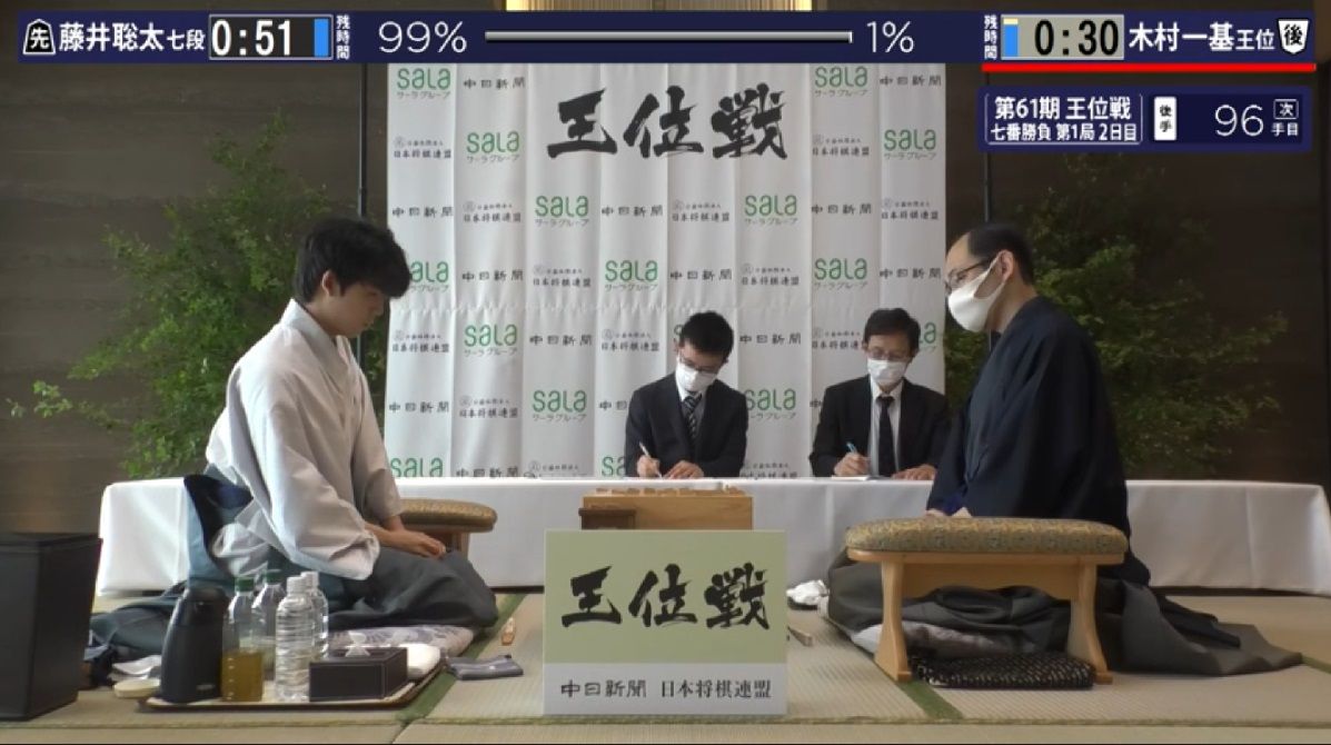 藤井聡太七段が木村一基王位に挑戦している第61期王位戦七番勝負(新聞三社連合主催)の第1局は2日、藤井七段が95手で勝って初タイトル獲得に向け好スタートを切った。第2局は7/13から札幌市で行われる。藤井七段の先手で角換わり腰掛け銀の戦型に進み、藤井七段の攻めを木村王位が堂々と受けて立ったことで1日目から激しい戦いになった。38手目 △4四歩が木村さんの藤井君の攻めを誘った作戦の1着。この歩を突くと、39手目 ▲4五歩と藤井君が攻めてくるのは必然。なんとこの39手目 ▲4五歩から最終手の95手目 ▲2五金まで藤井君は攻めの手を続けた。木村さんの用意したのは、42手目 △5二玉。この手と52手目 △9二角打の飛車取りに期待した指し手だったが、藤井君の攻めが強く功を奏せず。藤井君の61手目 ▲5三銀打が厳しい。馬に取られそうな4八金が木村玉を詰ます位置。入玉を阻んでいる。79手目 ▲1五歩が決め手。同歩に続く81手目 ▲2六金打の継続手があって木村玉は進退窮まった。以下△2三桂打は▲1五香△1四歩▲1一と△1五歩▲1二と△1四玉▲2一と左△2五歩▲1三と△2四玉▲3七桂、△1七桂は▲同香△同馬▲1五金△1四銀▲2五桂△同銀▲1一とで木村さん受け無し。藤井君の81手目 ▲2六金打が最後の木村さんの勝負所。実戦は82手目 △2三桂打としてしまったが、ここは△2三桂打に代えて△1四銀打として以下、 ▲1五香 △1八飛打 ▲1四香 △同王 ▲1五歩打 △同龍 ▲同金 △同王 ▲2七銀打 △2五金打ならば、少し本譜より綾があったようだ。85手目 ▲1一と。木村さんが局後の感想で『下から火あぶりだ』の通り、上から下から「玉は包むように寄せよ」の格言通りの攻め。74手目△ 3一金打や78手目 △3一桂打など、実に粘り強い守りの手を木村さん繰り出したが、届かず。