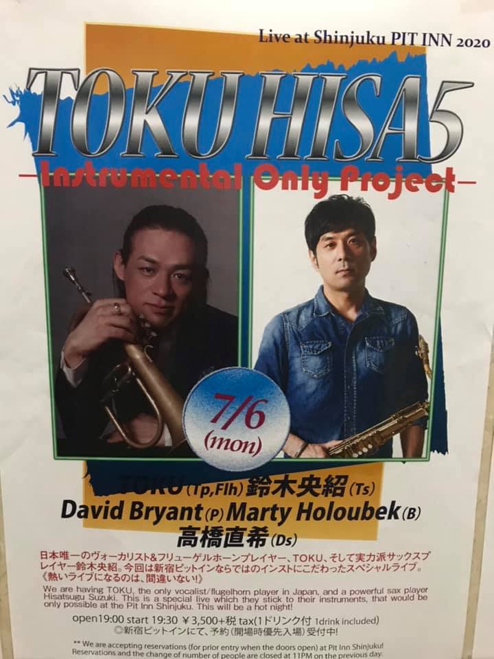 4 months have passed since <<2020 Mar 11th TOKU・HISA 5-Instrumental Only Project-@PIT INN, Tokyo>>, this time is the new TOKU/HISA session band with Marty Holoubek (B) and Naoki Takahashi (Ds) from Terumasa Hino band.Naoki has been trained on the Junko Onishi Trio tour also, so we introduced Naruyoshi Kikuchi's live performance comment during the <<80th Anniversary Concert-Wayne Shorter 4/Orchard Hall 2014/04/14>> Wayne Shorter's debut, which became a high priest through each year, is done every song every year. “What do you listen to without listening to this?” can be quoted as “Naoki Takahashi's debut through many hell tours” is also done every song every year. What do you listen to without listening to this?" Naoki-kun's drumming looked so much fun today, so it looked like heaven, not hell.1st show included mainly JAZZ standard songs. TOKU・HISA session standard ``1.Fee-Fi-Fo-Fun-By Wayne Shorter'', ``3.The Nearness of You-By Hoagy Carmichael'' 《2020 Jul 4th David Bryant (pf) Quintet 2nd Set@ "2.Perceptual-By Jon Cowherd", which was also played at "Body & Soul", and "4. Milestone". Groove on "4. Milestone" was awesome and I felt it was the best play I've heard in 2020.2nd show consisted of the member's original song Only. "6. Reliquiae old thing-By David Bryant" is also a song played by 2020 Jul 4th David Bryant (pf) Quintet 2nd Set@Body & Soul》. Based on their experiences two days ago, the play took a step up. “7.Shouga Aru -By Marty Holoubek" is a beautiful song that reminds me of a nostalgic British Folklore.The last two songs are "8. Be Careful" and "9. Closing" from TOKU's new album "TOKU in Paris". It was fun to hear the secret story about the album and the jacket photo shoot.<<2020 Mar 11th TOKU・HISA 5 -Instrumental Only Project-@PIT INN, Tokyo>>以来、約4か月振りの TOKU・HISAセッション。今回は日野皓正バンドのMarty Holoubekさん(B)、高橋直希君(Ds)が加わっての新生TOKU・HISAセッションバンド。直希君は大西順子トリオのツアーでも鍛えられているので、<< 80th Anniversary Concert-Wayne Shorter4/オーチャードホール 2014/04/14>>の際の菊地成孔さんのライブ紹介「数々の地獄巡りを経て高僧に達したウエイン・ショーターのデビューは毎年、毎曲ごとに行われるのである。これを聴かずに何を聴くか」を引用させてもらえば、「数々の地獄巡りを経た高橋直希のデビューは毎年、毎曲ごとに行われるのである。これを聴かずに何を聴くか」と思った。直希君の今日のドラミングはとても楽しそうだったので、地獄ではなく天国のように見えたが。1stはJAZZスタンダード中心。TOKU・HISAセッションの定番「1.Fee-Fi-Fo-Fun - By Wayne Shorter」、「3.The Nearness of You-By Hoagy Carmichael」に《2020 Jul 4th デビッド・ブライアント(pf)クィンテット 2nd Set@Body & Soul》でも演奏された「2.Perceptual-By Jon Cowherd」と「4.Milestone」。「4.Milestone」のGrooveは物凄く、2020年に聴いた中で随一のプレイと感じた。2ndはメンバーのオリジナル曲Onlyで構成された。「6.Reliquiae 古いモノ-By David Bryant」も2020 Jul 4th デビッド・ブライアント(pf)クィンテット 2nd Set@Body & Soul》で演奏された曲。2日前の経験を踏まえて、さらにステップアップ。「7.Shouga Aru しょうがある-By Marty Holoubek」は何故か懐かしい英国のFolkloreを思わせる美しい曲。ラスト2曲はTOKUさんの新アルバム「TOKU in Paris」から「8.Be Careful」、「9.Closing」。アルバム、ジャケット写真の撮影秘話などもお聞き出来て、楽しかった。<<2020 Jul 6th TOKU・HISA 5 -Instrumental Only Project-@PIT INN, Tokyo>>TOKU(Tp,Flh) 鈴木央紹(Ts) David Bryant(P)Marty Holoubek(B) 高橋直希(Ds)1st1.Fee-Fi-Fo-Fun - By Wayne Shorter2.Perceptual-By Jon Cowherd3.The Nearness of You-By Hoagy Carmichael4.Milestone-By Miles Davis2nd5.PASSAGE of DAY-By 鈴木 央紹6.Reliquiae 古いモノ-By David Bryant7.Shouga Aru しょうがある-By Marty Holoubek8.Be Careful-By TOKUEnc9.Closing-By Toku Jazz