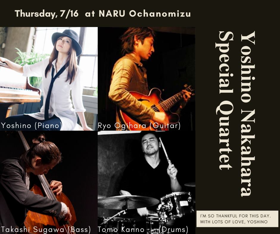 << 2020 Jul 11th 中原美野カルテット@日吉WonderWallYokohama >>に続いて、美野さんのカルテットのライブに参加。管(サックス)をギターに代えたサウンドで同じ楽曲、「1.Eve」、「2.I'm Begining To See The Light」、「3.Stiches」、「4.月の光」、「5.XENO」、「9.I'm Sorry」も違った味わいで楽しい。おそらくこの6曲は作成中の美野さんのアルバムに収録されると想像している。「I'm Begining To See The Light」はボーカルでGretchen Parlatoが歌うことをイメージして、美野さんがアレンジされたとのこと。Gretchenのアンニュイで囁くようなボーカルが入ると凄い魅力的な曲になりそう。是非、お聴きしたい。久々のTOMOさんのドラム、お「初」共演の須川さんのベースの魅力的なリズムセクション、美野さんのお気に入りの荻原さんのギターの音で美野さんのピアノの音色が「水を得た魚」のように躍動。久々に弾かれた1st Album' A Ray of Light'からの2曲「6.E-Funk-美野さんオリジナル」、「7.Summertime」も今日のカルテットならではの「をを」と唸りたくなるGroove。POPSの2曲「8.Mother Nature's Son - Paul McCartney」、「10.Waiting on the World to Change- John Mayer」も美野さんらしいアレンジで良かった。この2曲を歌えるボーカリストを入れても面白いかと感じた。<< 2020 Jul 16th 中原美野カルテット@Ochanomizu Naru >>pf 中原美野 gt 荻原亮 b 須川 崇志 ds 菅野 知明1st1.Eve-美野さんオリジナル2.I'm Begining To See The Light-Duke Ellingtonなど。Gretchen Parlatoが歌うことをイメージして、美野さんがアレンジ3.Stiches-Shawn Mendes4.月の光-ドビッシー5.XENO-JUVENILE2nd6.E-Funk-美野さんオリジナル7.Summertime8.Mother Nature's Son - Paul McCartney9.I'm Sorry-美野さんオリジナルEnc10.Waiting on the World to Change- John Mayer