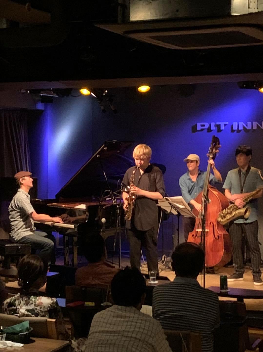 今日は山中一毅カルテットを聴きに昼ピに参上!<< 2016 Jun 26th 山中一毅4@ 御茶ノ水NARU >>以来、約4年振りの山中一毅カルテット。その時とは、全くピアノトリオが変わっていて新しいリズム。ピアノトリオ全員が山中さんのオリジナルの曲を楽しんでいた。1st SetはColtraneの世界を思わせる、独自の世界。「1.Dancer in Nirvana」は京都の三十三間堂をモチーフにした曲。丁度、去年の10月に三十三間堂に行ったので、何となく山中さんの言われた「千手観音立像全1,001体の放つ猛烈なエネルギー」の意味が分かった。2nd Set。「5.It Could Happen To Lee」は「It Could Happen To You」の替え歌でアップテンポの曲。山中さんの指針にもなっている、恩師Lee Konitzに捧げて作った。実際、Leeさんのご自宅に行って、レッスンを受けていて、Leeさんからも替え歌(Contrafact)作りを勧められたとのこと。<<2020 Sep 5th 山中一毅カルテット@PIT INN, 新宿>>山中一毅(As)渡辺翔太(P)落合康介(B)大村 亘(Ds)1st1.Dancer in Nirvana2.新曲(タイトル未定)3.新曲(タイトル未定)4.新曲 Double B2nd5.It Could Happen To Lee - Lee Konitzに捧げた替え歌(Contrafact)。6.新曲 Tears of Hiroshima - 7月に初めて広島を訪れてInspireされて作曲7.新曲 Beyond Purgatory(煉獄-天国と地獄との間にある所。死者の霊が天国にはいる前に、ここで火によって浄化される)8.ReminiscenceEnc9.Anthropology-Dizzy Gillespie&Charlie Parker