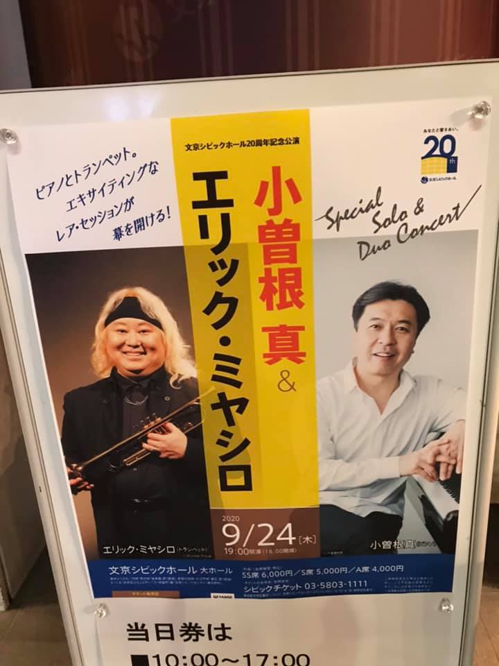 本日は文京シビックホールまで小曽根さんとエリックさんのDuoを聴きに参上!小曽根さんは今日は14時くらいから文京シビックホールに「入り」。素晴らしいSTEINWAY&SONSのピアノと素敵なホールでのリハで1st Showの予定時間を10分も超過して、ノリノリの小曽根さん。「大変、気持ちの良い時間」に予定時間をオーバー。エリックさんの温かい音で小曽根さんのピアノの深みが大いに増す。MCもお二人がどのように出会ったかなど、長~い歴史のお話など、軽快で楽しい。MCの詳細と今日のセットリストは9/29(火)の住友生命いずみホール@大阪城の近く|のDUOライブ終了後に追記予定。<< 2020 Sep 24th DUO 小曽根真&エリック・ミヤシロ@文京シビックホール>>〈第1部〉小曽根真/Always TogetherWishy WashyNeed to WalkIf I had knownThe Puzzle〈第2部〉Tomaso Albinoni/Concerto No.3 in B♭ major op.7 for oboe&pianoエリック・ミヤシロ/Sky danceEdgar Sampson/Stomping at the Savoy小曽根真/Improvisation〈アンコール〉Charlie Chaplin/Smile# Setlistは2020年9月29日(火曜日)23:30に追記。