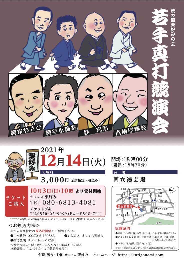 本日は若手4人の実力者の落語を聴きに国立演芸場に参上!この4人にしては意外にも「札止め」では無く、前の週の終わりにでも予約出来た。10列目辺りの中央の席なので、好位置。宮治さんのマクラの通りか、神田伯山さんが主任の新宿末廣亭にお客を取られた?柳枝さんの「七段目」とわさびさんの「死神」はナカナカの出来。わさびさんは新作しかやらないのかな~と勝手に思い込んでいたが、古典の「死神」も見事。サゲもわさびさんの独自の工夫。<< 2021 Dec 14th 第23回栗好みの会「年忘れ若手真打競演会」@国立演芸場 (永田町) >>一. 開口一番「平林」三遊亭まんと一.「お血脈」(のサワリ、殆どマクラ)桂宮治一.「粗忽長屋」柳亭小痴楽<仲入り>一.「七段目」春風亭柳枝一.「死神」柳家わさび